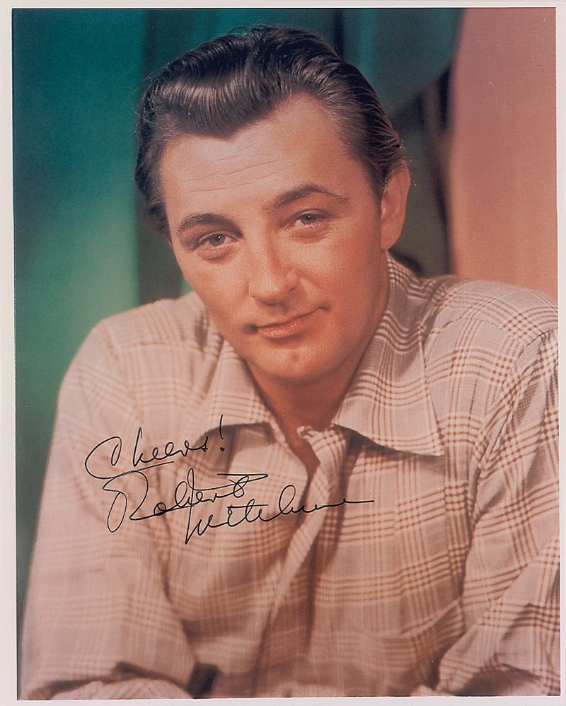 Color glossy 8 x 10 head-and-shoulders photo of a suave Mitchum, signed in black felt tip. In fine condition, with photo slightly off-center and a couple trivial dings in bottom edge.