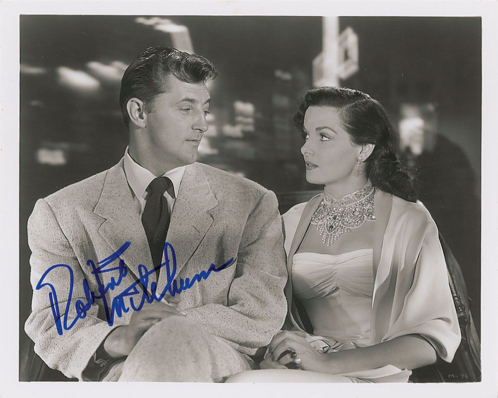 Glossy 10 x 8 photo of Mitchum and Jane Russell in the 1952 film Macao, signed in blue felt tip. In very fine condition.