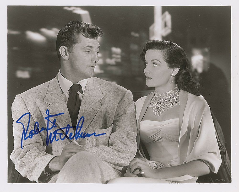 Glossy 10 x 8 photo of Mitchum talking to Jane Russell in Macao, signed in blue felt tip by Mitchum. In very fine condition.