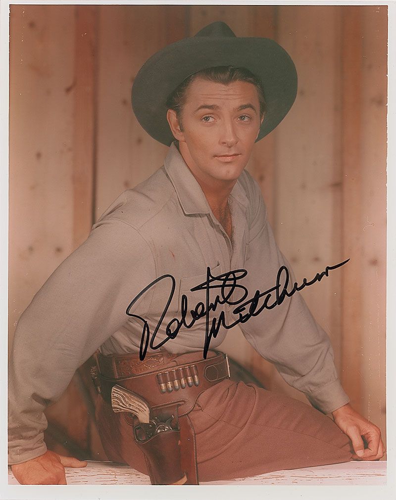 Color glossy 8 x 10 photo of Mitchum in western gear with a six-shooter at his side, signed in black felt tip. In very fine condition.