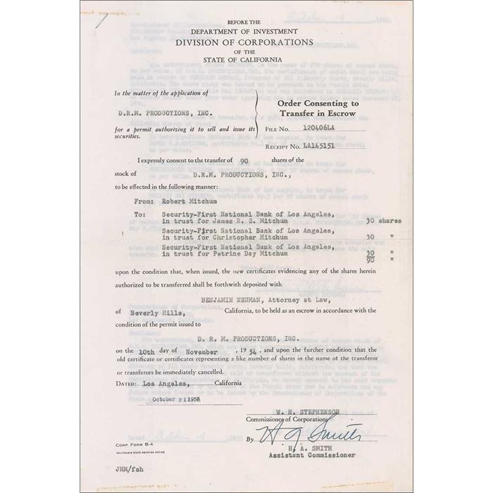 DS, two pages, 8.5 x 12.5, October 14, 1955. Order consenting to transfer in escrow between D. R. M. Productions to three trusts for Mitchum’s children, who each receive 30 shares. Signed on the second page by Mitchum. Staple to top left, some light creasing and wrinkling, and a bit of mild toning, otherwise fine condition. Pre-certified PSA/DNA and RRAuction COA.