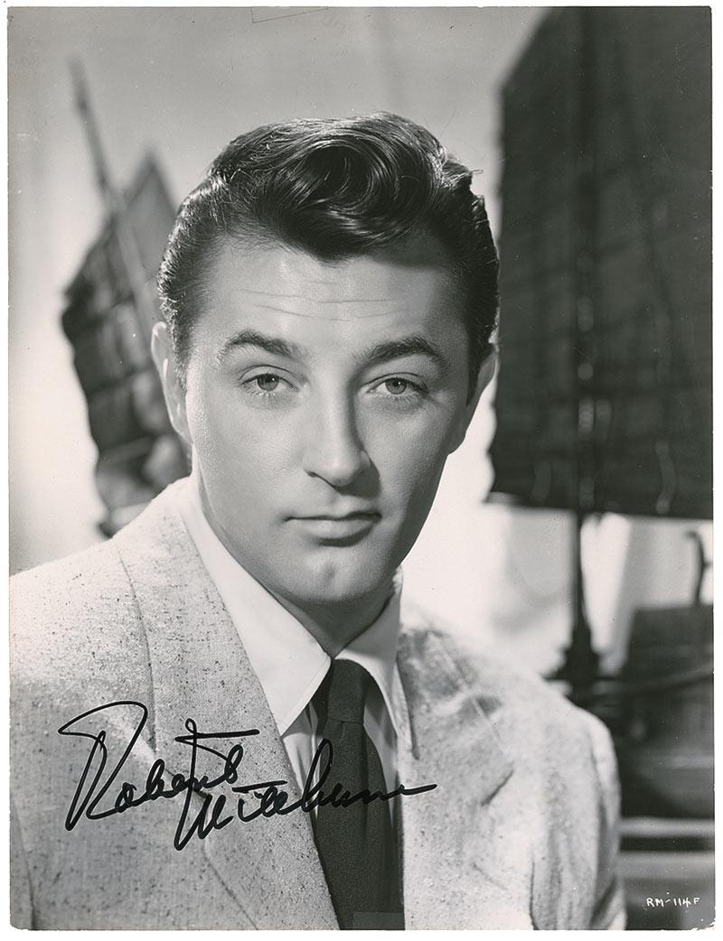 Handsome glossy 7.25 x 9.5 photo of Mitchum in a jacket and tie, signed in black felt tip. In fine condition, with trimmed edges and some scattered light surface marks and creases.