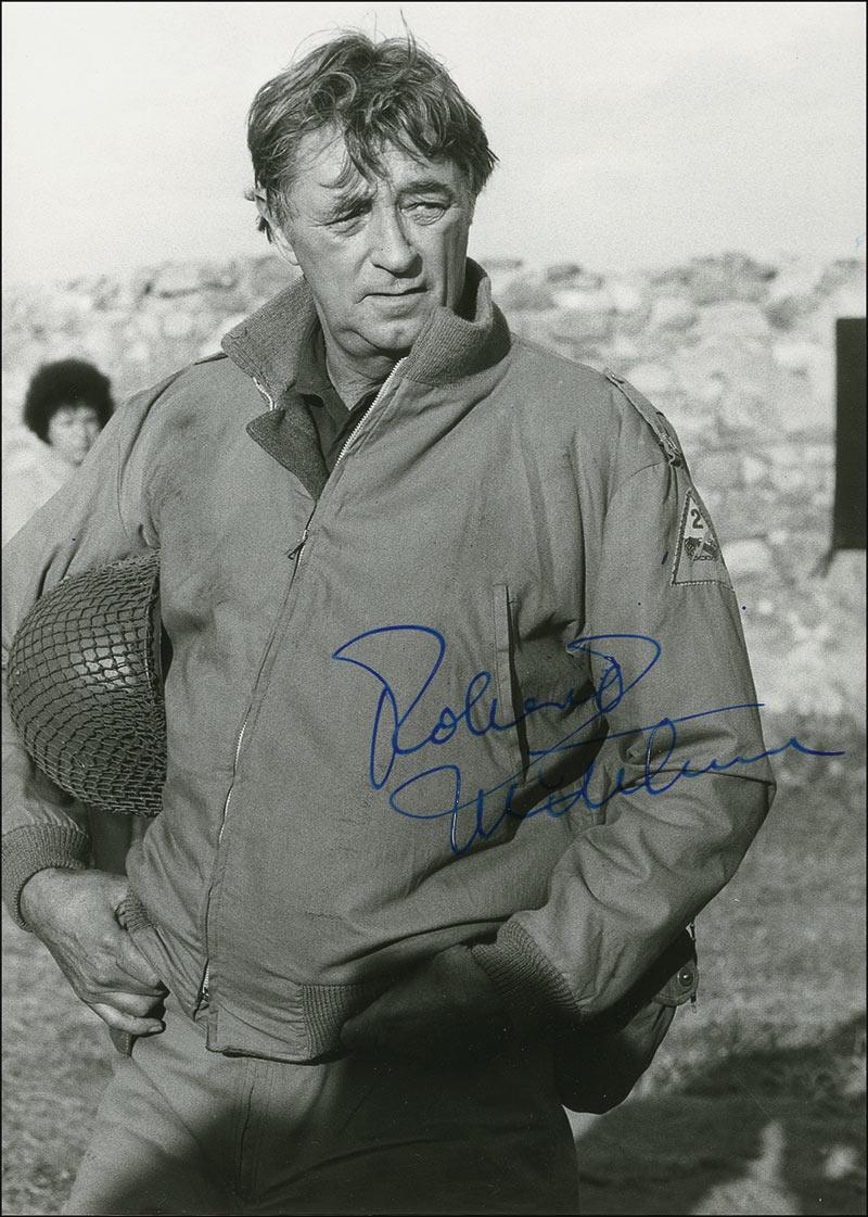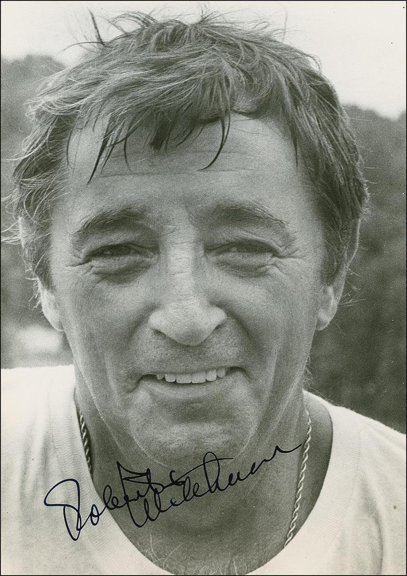 Two signed glossy photos: a 7 x 9.5 photo of Mitchum in military gear, signed in blue felt tip; and a 6.5 x 9 head-and-shoulders photo, signed in black felt tip. In fine condition, with a few light creases to second photo.
