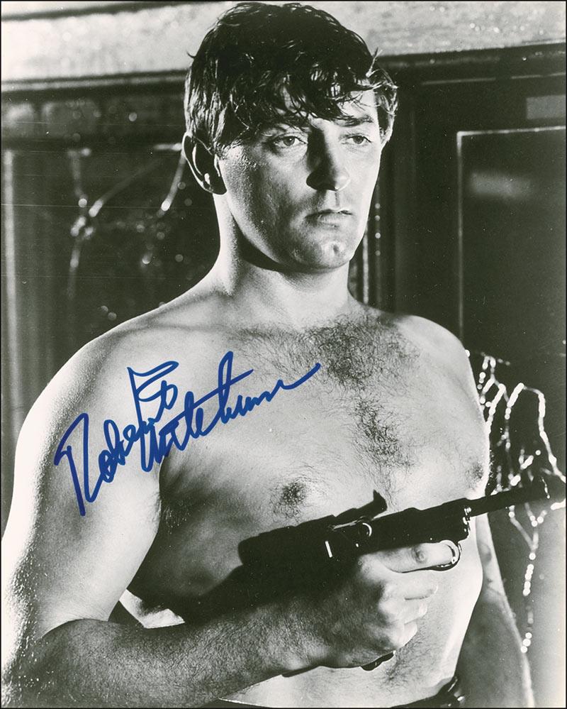 Two glossy 8 x 10 photos, one of Mitchum in a suit and tie signed in black felt tip, and one of the shirtless actor holding a gun, signed in blue felt tip. In overall fine condition.