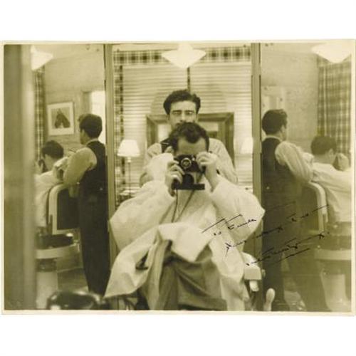 <B>Robert Montgomery Signed Photo to Emile LaVigne.</B></I> Clever 11" x 14" matte finish shot of Robert Montgomery (1904-1981), seated in a makeup chair at MGM, taking a picture in a mirror and capturing both himself in makeup man Emile LaVigne, then beginning his career. Montgomery has signed in black fountain ink, "To Emile - Here's looking at us - Robert Montgomery." The picture dates circa 1938, when Montgomery received an Academy Award Best Actor nomination for <I>Night Must Fall,</B></I> and LaVigne worked on <I>The WIzard of Oz.</B></I> A few minor surface creases; overall Very Fine condition <I> From the Estate of Emile LaVigne.</B></I><BR><BR><b>Shipping:</b> Flat Material, Small (<a target="_blank" href="http://www.heritageauctions.com/common/shipping.php">view shipping information</a>)