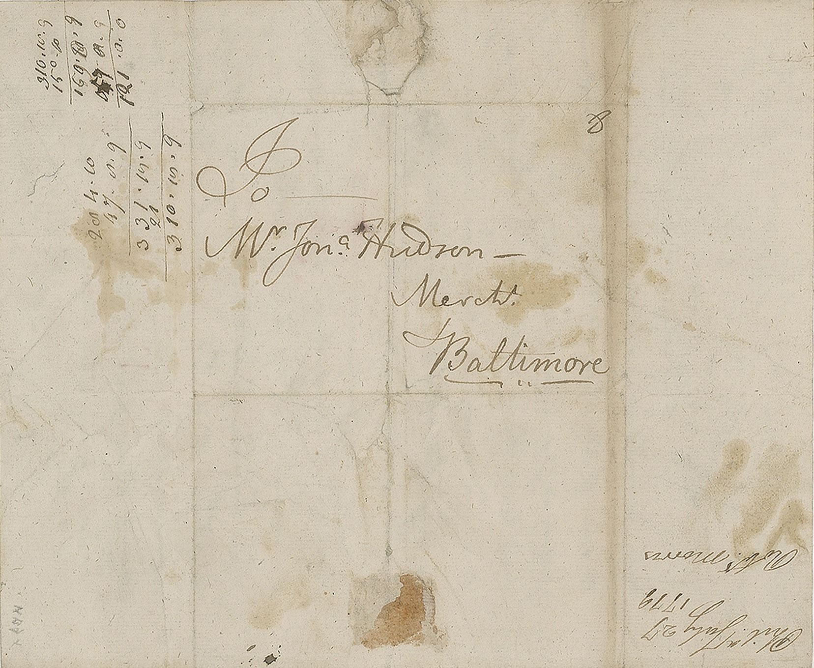 Revolutionary War-dated ALS signed “Rob't Morris,” one page, 7.75 x 9.5, July 27, 1779. Letter to Baltimore merchant Jonathan Hudson, in part: "I think your Brother's Conduct very meritorious & will represent it properly to some of the members of Congress, but cannot promise you in these days how far merit will be noticed or rewarded. I am very sorry to hear of such an amazing price being given Spesutie Island & think both buyers & sellers ought to come under the notice of Committees. If you cannot buy lands as you proposed I don't know but your plan of buying, loading & fitting a couple of very fine Virginia built boats may be eligible and turn to good…but I would advise that they be fine boats and every thing in & about them, if that is done you will succeed." In very good condition, with scattered staining, repairs to the seal-related paper loss to the integral address leaf, complete silking on the reverse, and ink erosion affecting both the text and the signature.
