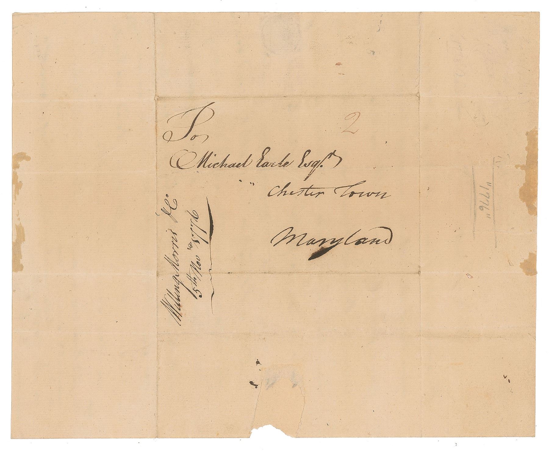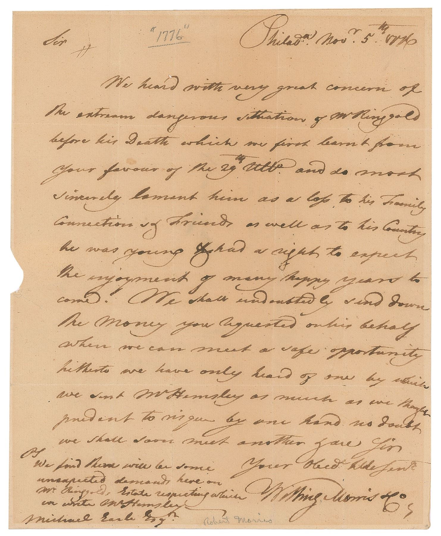 Revolutionary War-dated ALS from Robert Morris signed “Willing Morris & Co.,” one page, 7.5 x 9, November 5, 1776. Letter to Michael Earle, in full: "We heard with very great concern of the extream dangerous situation of Mr. Ringgold before his death which we first learnt from your favour of the 29th ult'o and do most sincerely lament him as a loss to his family connection & friends as well as to his country he was young & had a right to expect the enjoyment of many happy years to come. We shall undoubtedly send down the money you requested on his behalf when we can meet a safe opportunity hitherto we have only heard of one by which we sent Mr. Hemsley as much as we thought prudent to risque by one hand no doubt we shall soon meet another yare." Morris adds a brief postscript: "We find there will be some unexpected demands here on Mr. Ringgold's estate respecting which we write Mr. Hemsley." In very good to fine condition, with light toning from prior display, and seal-related paper loss to the integral address leaf.