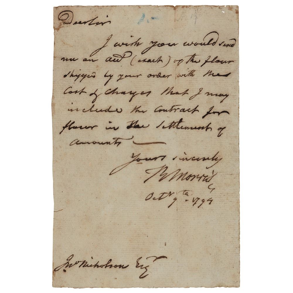 ALS signed “R. Morris,†one page, 4.75 x 7.25, October 9, 1794. Handwritten letter to his close friend and business partner John Nicholson, regarding the purchase of flour for the North American Land Company, in full: "I wish you would send me an acct (exact) of the flour shipped by your order with the cost of charges that I may include the contract for flour in the settlement of amounts." In fine condition, with light soiling.