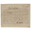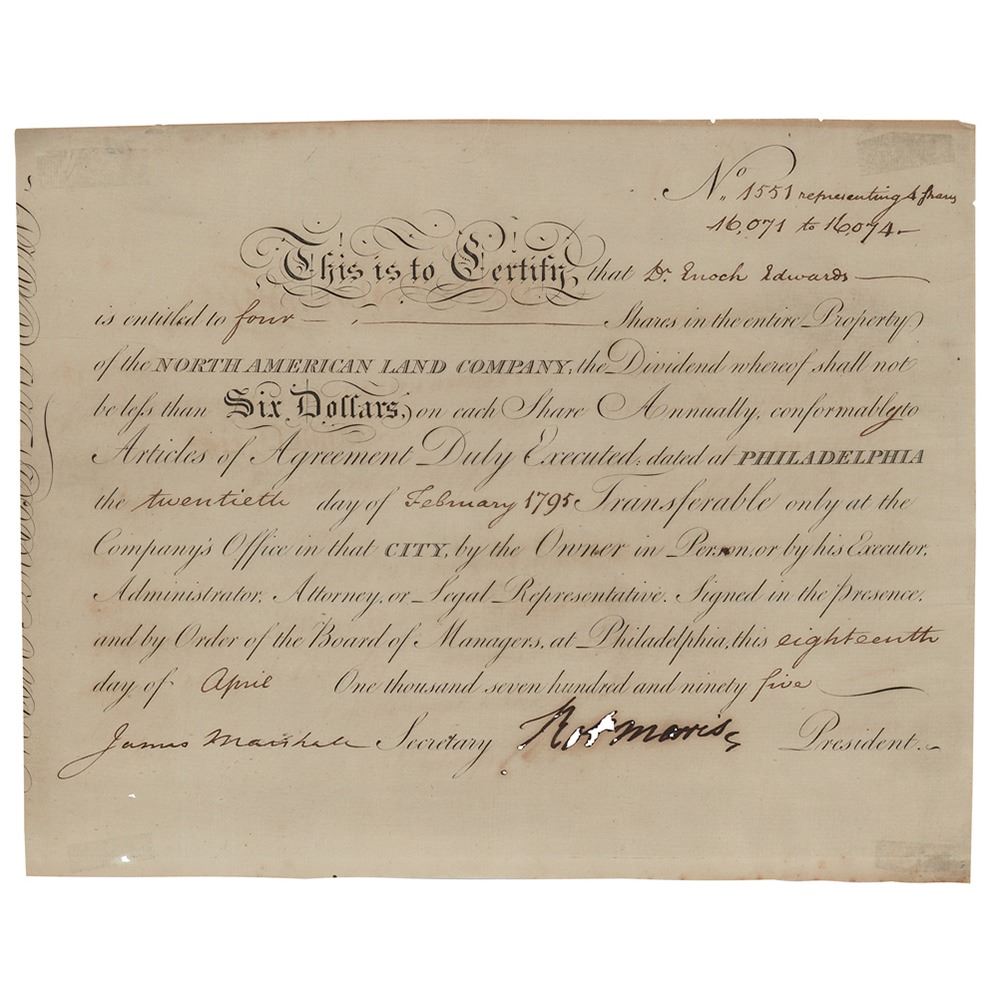 Partly-printed DS, signed “Rob't Morris,†one page, 11.75 x 9.5, April 18, 1795. Document certifying that "Dr. Enoch Edwards is entitled to four Shares in the entire Property of the North American Land Company, the Dividend whereof shall not be less than Six Dollars on each Share Annually." Signed at the conclusion by Morris as the company's president and countersigned by James Marshall as secretary. In very good to fine condition, with stains at the corners from old tape on the back, and ink erosion to the signature.