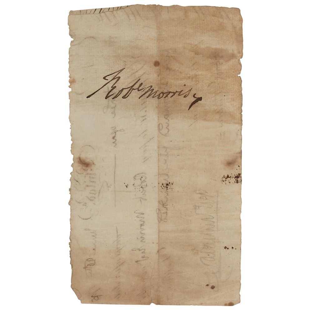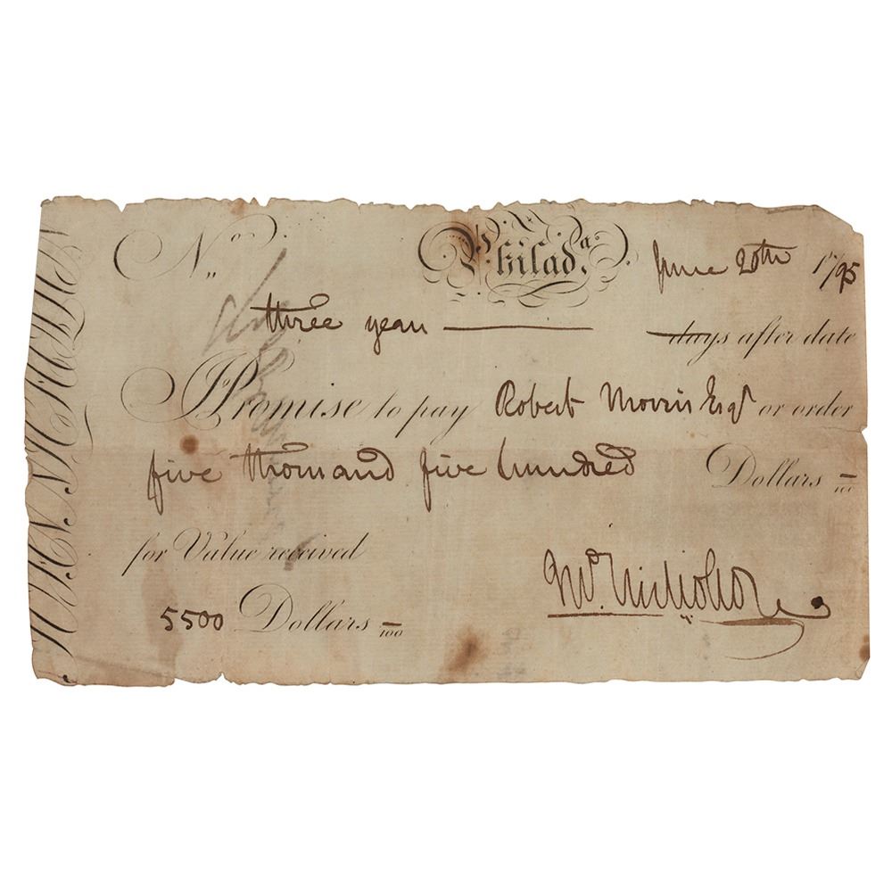 Partly-printed DS, signed “Rob't Morris,†one page, 6.5 x 3.75, June 20, 1795. Promissory note in which John Nicholson agrees to pay Morris $5,500 three years later, endorsed on the reverse by Morris. In very good to fine condition, with soiling and toning to both sides.