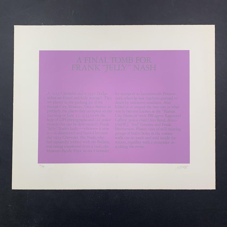 Robert Morris's "A Final Tomb for Frank "Jelly" Nash" limited edition print, signed and dated lower right, and numbered 171/180 lower left. This piece is of text against a purple background, paying tribute to Frank Nash. This piece is in excellent condition.