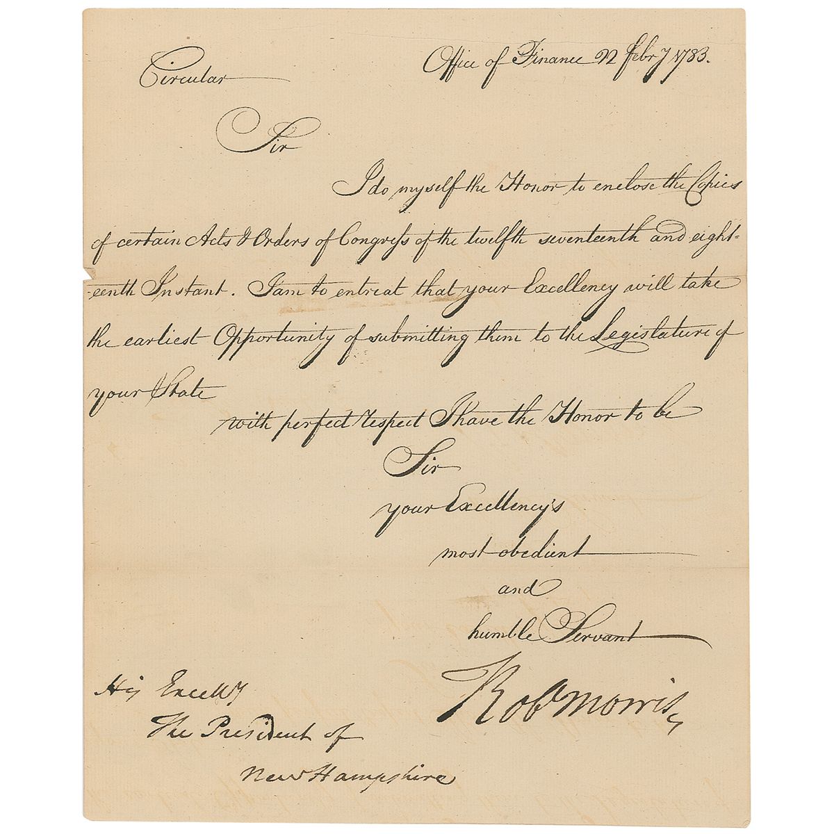 ‘Financier of the Revolution,’ and one of only two signers of all three of the founding documents—The Declaration of Independence, The Articles of Confederation and the Constitution. Revolutionary War-dated LS signed “Robt Morris,” one page, 7.5 x 9, February 7, 1783. Circular letter, in his capacity as Superintendent of Finance, addressed in the lower left in Morris’s hand, “His Excelly, The President of New Hampshire.” In full: “I do myself the honor to enclose the Copies of certain Acts & Orders of Congress of the twelfth seventeen and eighteenth Instant. I am to entreat that your Excellency will take the earliest Opportunity of submitting them to the Legislature of your State.” Some scattered light soiling and some light mirroring of ink from folding, otherwise fine, clean condition. Accompanied by a nice engraving of Morris.