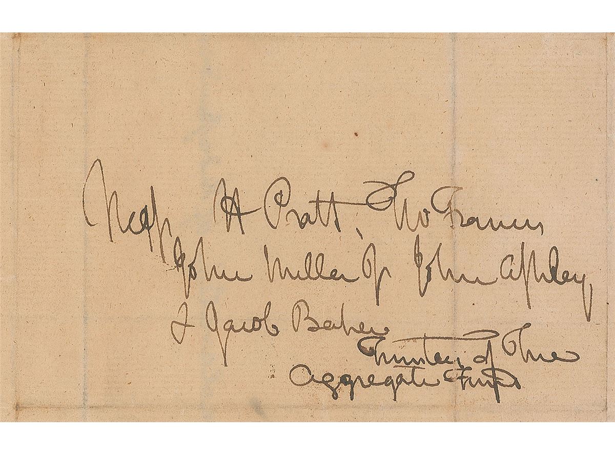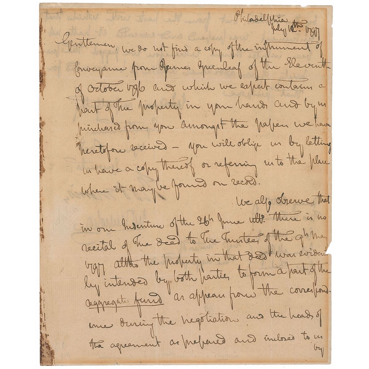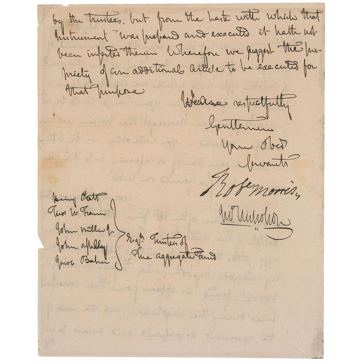 Important financier who signed the Declaration of Independence, Articles of Confederation, and Constitution (1734–1806). LS signed “Rob’t Morris,” one page both sides, 7.75 x 9.25, July 12, 1797. Letter to the “Trustees of the Aggregate Fund.” In part: “We do not find a copy of the instrument of conveyance from James Greenleaf…you will oblige us by letting us have a copy thereof…There is no recital of the deed to the Trustees of the 9th May 1797 altho the property in that deed was evidently intended by both parties to form a part of the aggregate fund as appears from the correspondence during the negotiation…we suggest the propriety of an additional article to be executed for that purpose.” Signed at the conclusion by Morris and countersigned by his business partner John Nicholson. In very good condition, with intersecting folds, toning and some chipping to edges, and stains along the left edge. Accompanied by an unsigned engraved portrait and the original address panel, now detached from the letter. Morris, Nicholson, and Greenleaf formed the North American Land Company in the 1790s in a disastrous real estate speculation scheme that ultimately went bankrupt, resulting in Morris being held in debtor's prison for over three years.