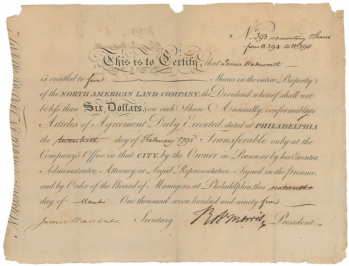 Partly-printed DS, signed “Rob’t Morris,” one page, 12.5 x 9.5, March 19, 1795. Document certifying that “James Wadsworth is entitled to five Shares in the entire Property of the North American Land Company; the Dividend whereof shall not be less than Six Dollars on each Share Annually.” Boldly signed at the conclusion by Morris as the company’s president and countersigned by James Marshall as secretary. In fine condition, with intersecting folds and some small tears and chips to edges; nicer than typical examples of these certificates. Accompanied by an unsigned engraved portrait of Morris bearing a facsimile signature.