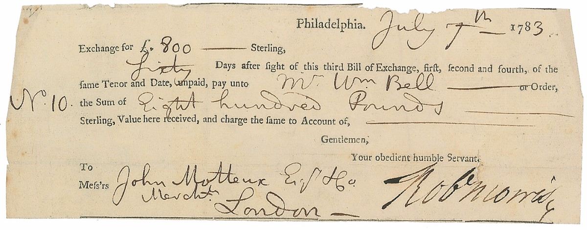 Important financier who signed the Declaration of Independence, Articles of Confederation, and Constitution (1734–1806). American Revolutionary War-dated partly-printed DS, signed “Robt. Morris,” one page, 9 x 3.25, July 7, 1783. An international currency exchange, in part: “Sixty Days after sight of this third Bill of Exchange, first, second and fourth, of the same Tenor and Date, unpaid, pay unto Mr. Wm. Bell or Order, the sum of Eight hundred Pounds Sterling.” Signed at the conclusion by Morris. In very good condition, with a small tear to body touching the tip of the signature.