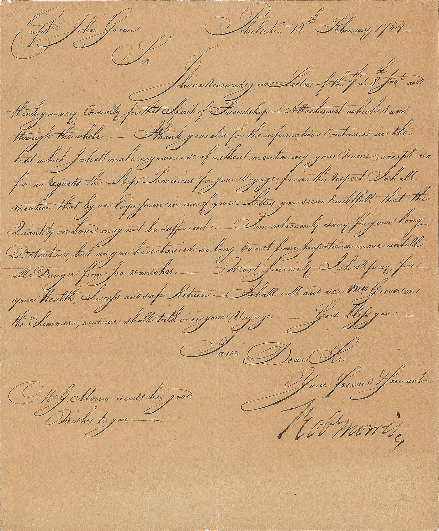 LS signed “Rob't Morris,” one page, 7.5 x 9, February 14, 1784. Letter to Captain John Green, in part: "I thank you…for the information…which I shall make my own use of without mentioning your name, except so far as regards the Ships Provisions for your Voyage, for in this respect I shall mention that by an Expression in one of your Letters you seem doubtfull that the Quantity on board may not be sufficient. I am extremely sorry for your long Detention, but as you have tarried so long, do not from Impatience move untill all Danger from Ice vanishes." In fine condition, with small splits along intersecting folds. Green was the captain of the Empress of China, initially built as a privateer in 1783 but converted to a merchant ship after the Treaty of Paris brought an end to the Revolutionary War. Robert Morris was one of the vessel's owners as part of a syndicate. The ship would leave New York harbor on February 22, and it became the first American merchant vessel to enter Chinese waters. Green and the Empress of China returned to New York a year later, and the success of the voyage encouraged future trade missions to China.
