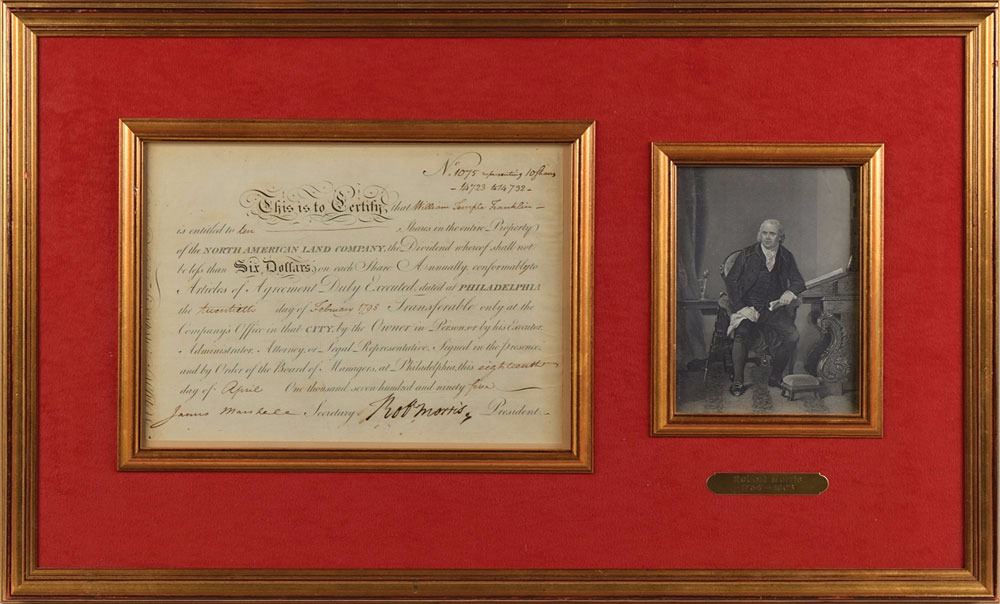 Partly-printed DS, signed “Rob't Morris,” one page, 12 x 8.5, April 18, 1795. Document certifying that "William Temple Franklin is entitled to ten Shares in the entire Property of the North American Land Company; the Dividend whereof shall not be less than Six Dollars on each Share Annually." Boldly signed at the conclusion by Morris as the company's president and countersigned by James Marshall as secretary. Matted and framed with an engraving of Morris to an overall size of 28.75 x 17.25. In fine condition.