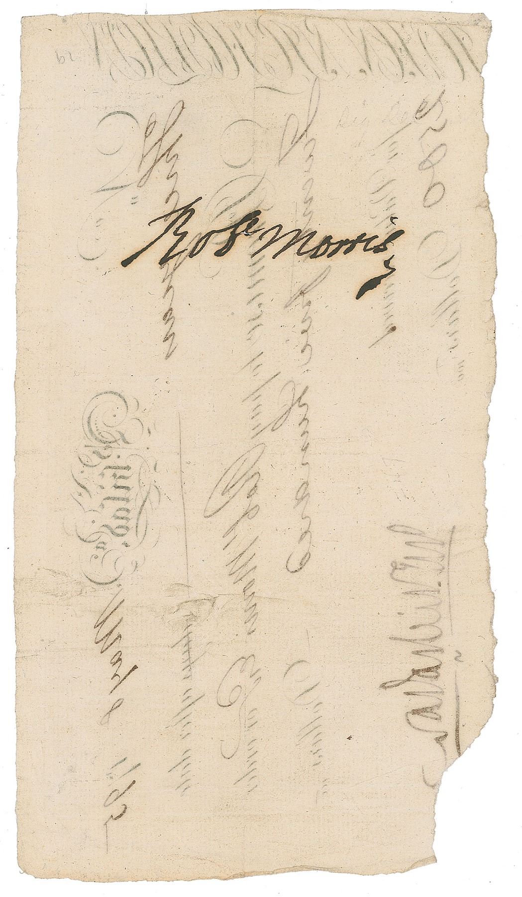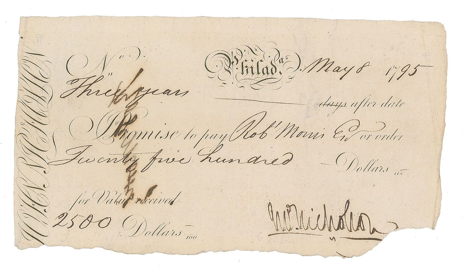 Important financier who signed the Declaration of Independence, Articles of Confederation, and Constitution (1734–1806). Partly-printed DS, signed on the reverse, “Rob't Morris,” one page, 7.25 x 4, May 8, 1795. Promissory note in which John Nicholson promises to pay Robert Morris $2500 three years later. Boldly endorsed on the reverse by Morris. In fine condition, with paper loss to the bottom and slight ink erosion to the signature.
