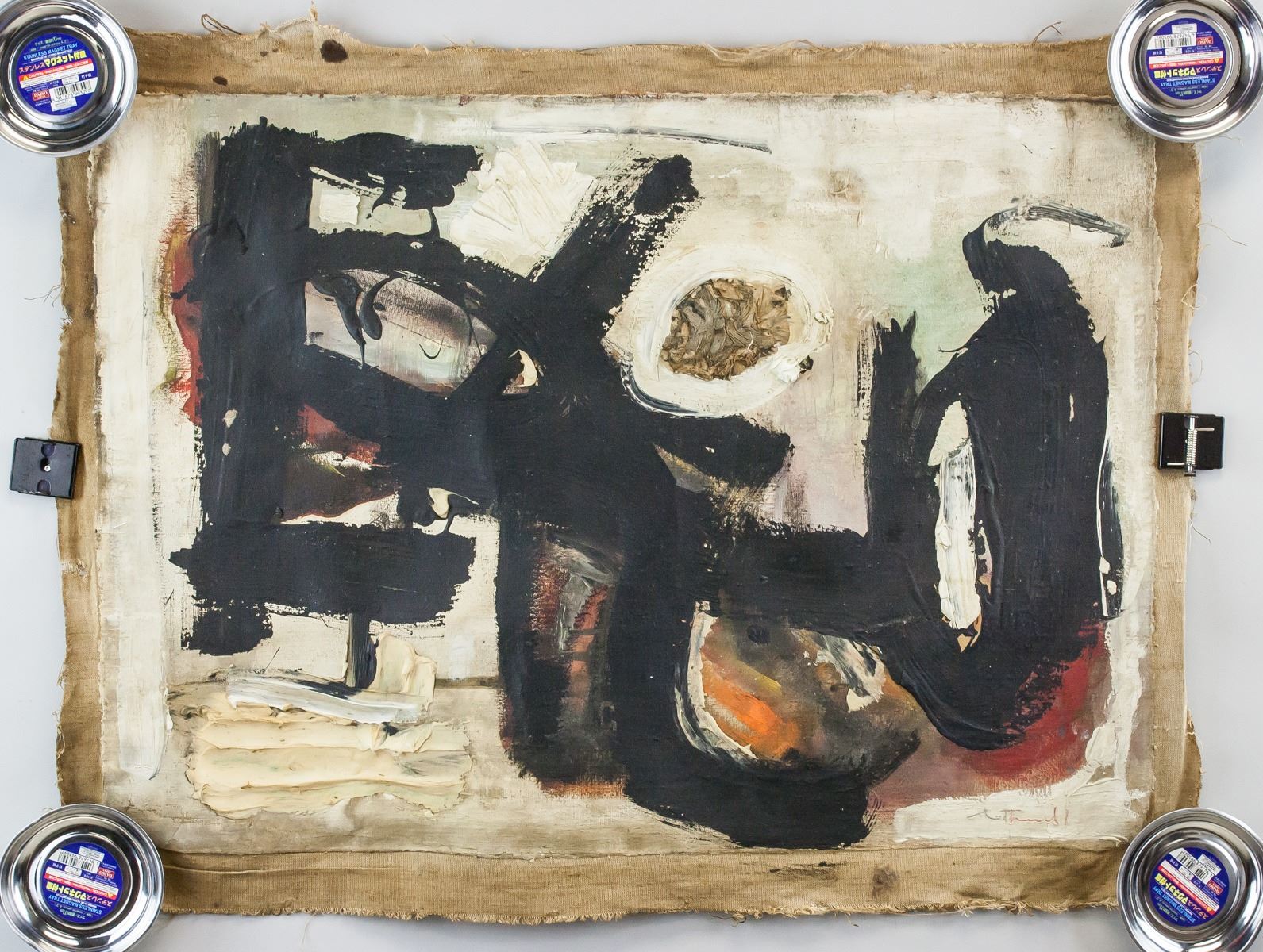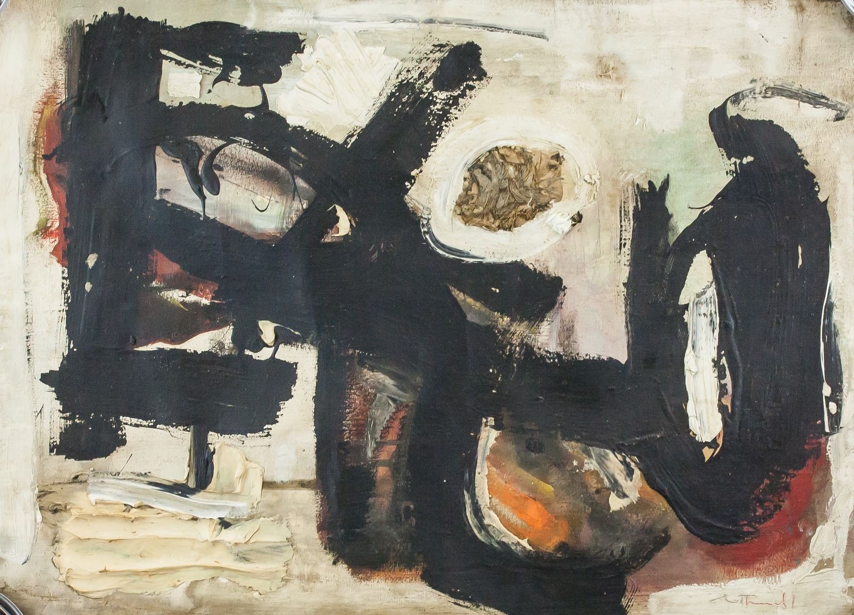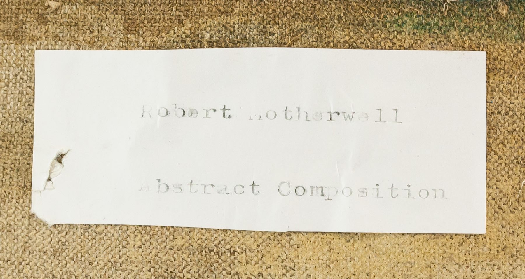 Oil on canvas. Featuring abstract composition. Signed in the bottom right corner. "DF24" stamped on verso. Paper affixed to verso reads "Robert Motherwell Abstract Composition". Faint illegible stamp on verso. Attributed to Robert Motherwell (1915-1991, American). 58 x 74 cm (23 x 29 inches). PROVENANCE: This lot carries limited provenance from an Upper New York estate
