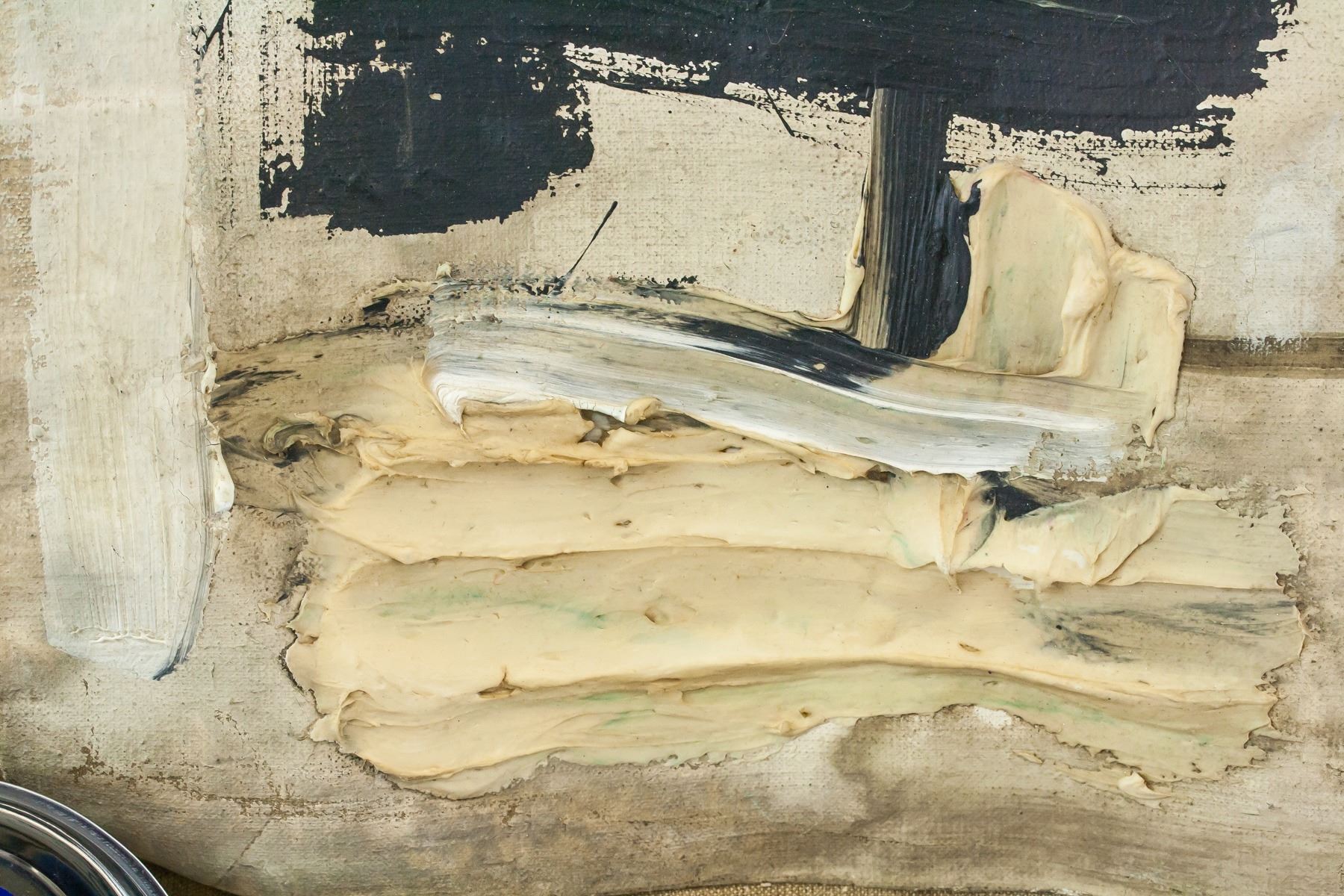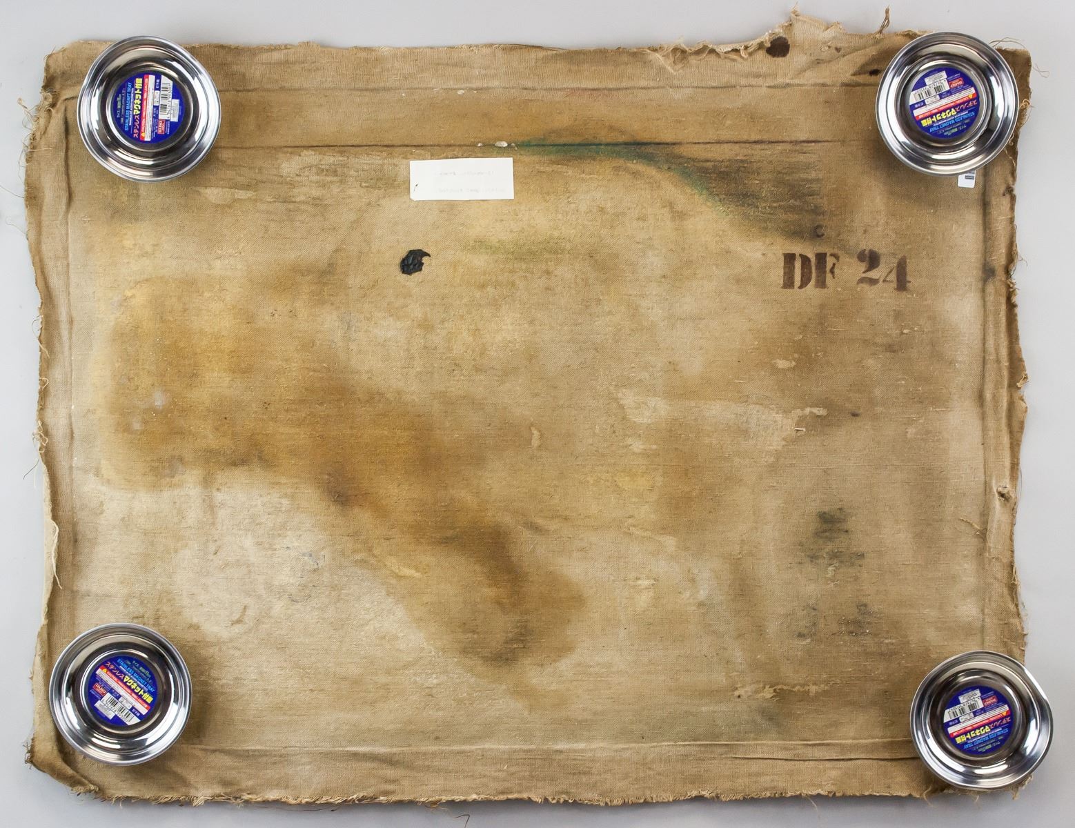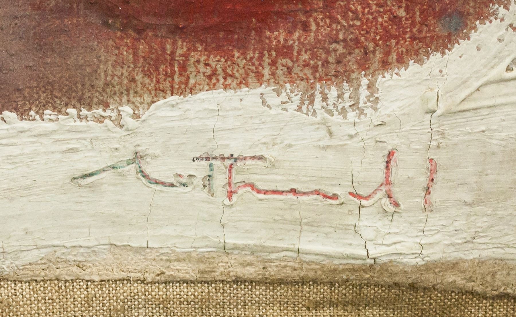 Oil on canvas. Featuring abstract composition. Signed in the bottom right corner. "DF24" stamped on verso. Paper affixed to verso reads "Robert Motherwell Abstract Composition". Faint illegible stamp on verso. Attributed to Robert Motherwell (1915-1991, American). 58 x 74 cm (23 x 29 inches). PROVENANCE: This lot carries limited provenance from an Upper New York estate
