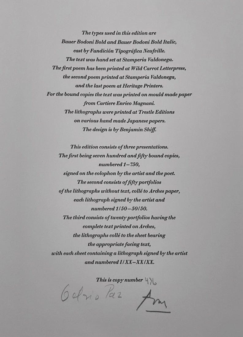 ROBERT MOTHERWELL (1915 - 1991) LARGE Original lithograph in color. From the folio: "Tres Poems" by Octavio Paz. Published by the Limited Editions Club in 1987 in an edition of 750. In good condition. Sheet size: 22 x 18 1/2. Printed at Trestle Editions on hand-made Japanese paper.