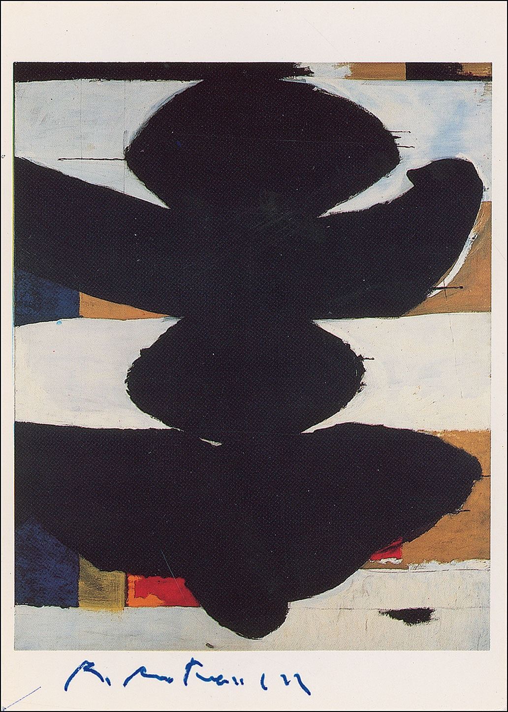 Color 4.25 x 6 postcard photo of a Robert Motherwell painting entitled 'Elegy to the Spanish Republic,' signed in the lower border in blue felt tip. In fine condition.