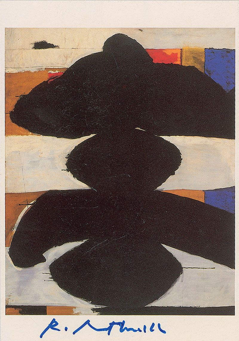 Color 4 x 6 postcard of Motherwell’s work entitled ‘Elegy to the Spanish Republic #34,’ signed in the lower border on the front in blue felt tip, “R. Motherwell.” In fine condition.
