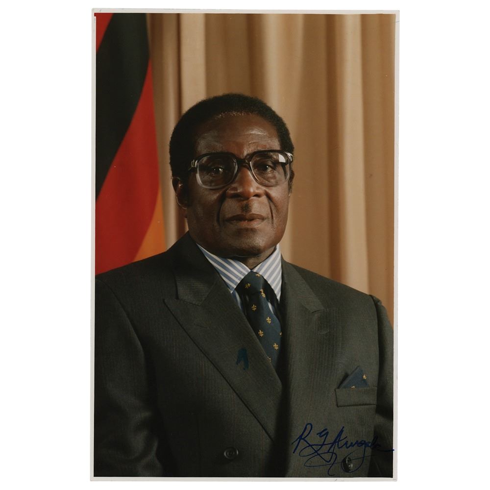 Color glossy 3.75 x 6 photo of Mugabe, signed in blue ink, "R. G. Mugabe." In very good to fine condition, with light bends and creases. Accompanied by a transmittal letter from the 'Department of Information and Publicity, Office of the President and Cabinet,' dated to March 6, 2003.