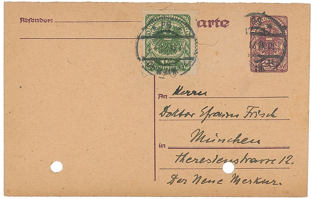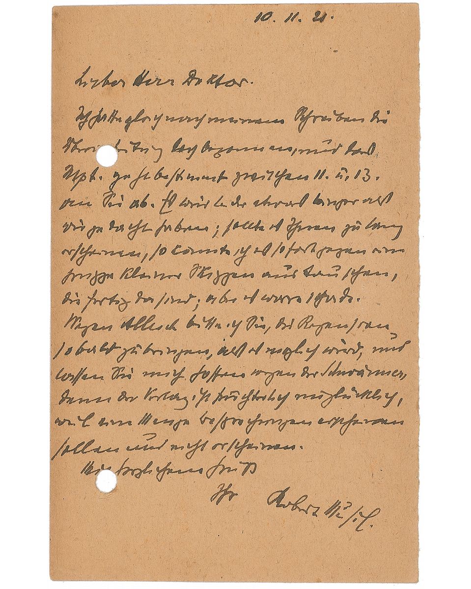Renowned Austrian writer (1880–1942) whose unfinished novel The Man Without Qualities is regarded as one of the most important modernist novels. Rare ALS in German, one page, 3.5 x 5.5, November 10, 1921. Untranslated letter to Dr. Efraim Frisch regarding Musil’s novel Grigia. In fine condition, with two punch holes to the left edge, affecting two words. In 1912, Frisch became an editor at Georg Mueller Verlag and was in charge of publishing some of the most famous German-speaking authors of his time, including Mann and Musil. He went on to form the literary and political journal The New Mercury, bringing many of his publishing connections with him. An incredibly rare and important German literary figure, this is only the second Musil we have ever offered.