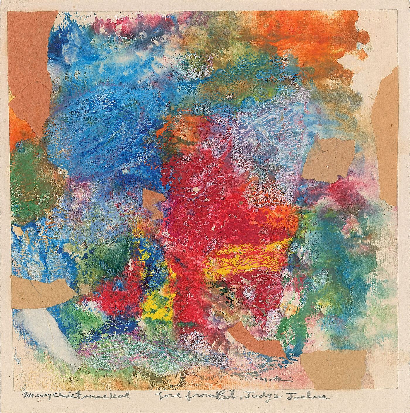 American painter (1930–2010) associated with abstract expressionism and color field painting. Colorful original artwork by Robert Natkin accomplished in acrylic and glued paper on a 7.75 x 7.5 sheet, signed at the bottom in pencil, "Natkin." The painting has been applied to a slightly larger 8.25 x 8.25 sheet, signed and inscribed in the lower border in pencil, "Merry Christmas Hal, love from Bob, Judy & Joshua." In fine condition. Accompanied by a catalog from Natkin's 1980 exhibition at Tortue Gallery.