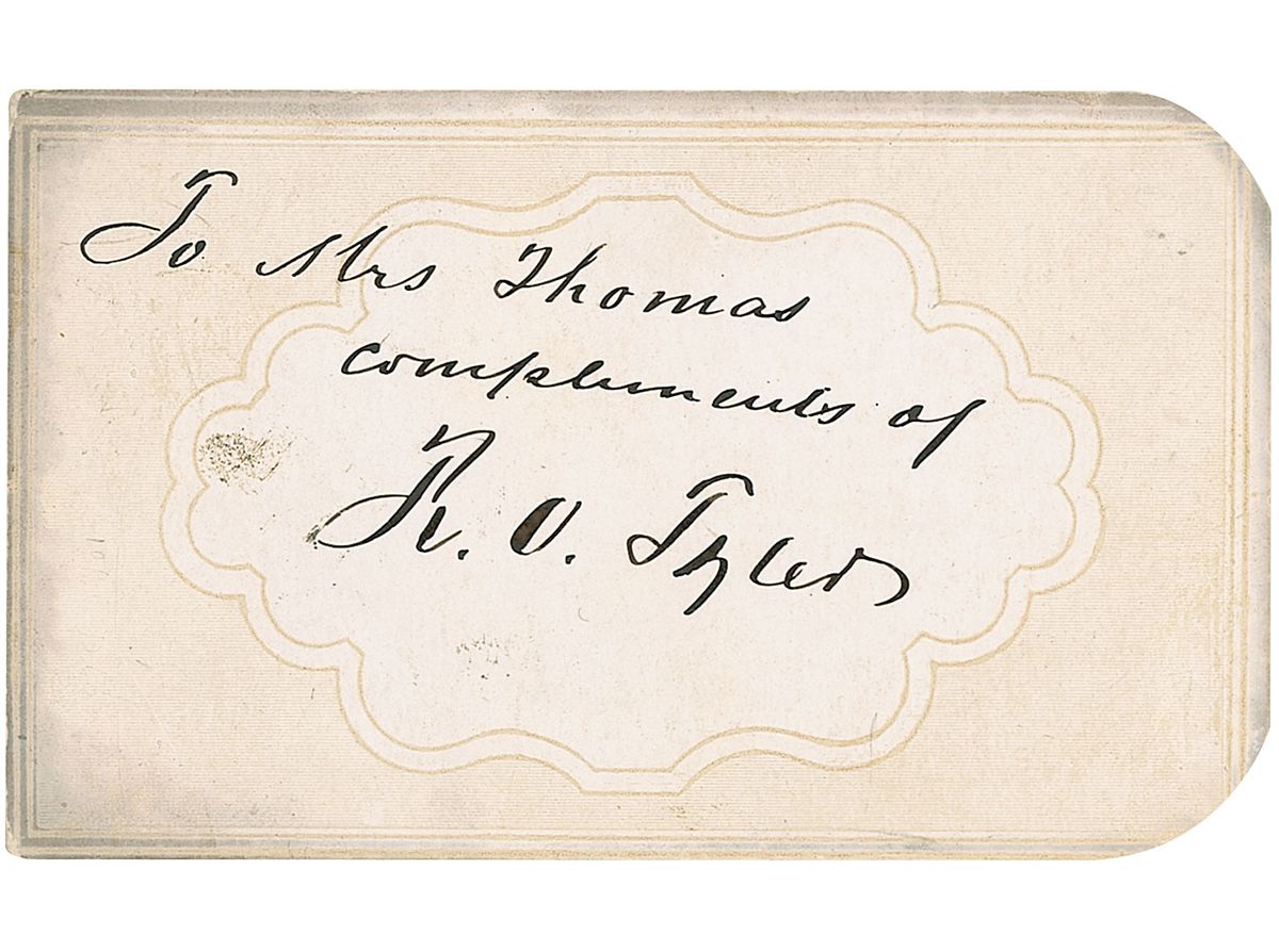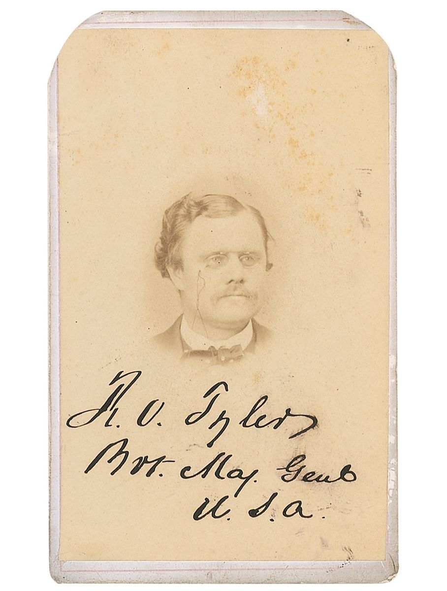 Union general (1831–1874) who commanded the Artillery Reserve of the Army of the Potomac at the Battle of Gettysburg. Original 2.5 x 4 carte-de-visite portrait by an anonymous studio, signed at the bottom of the image in black ink, “R. O. Tyler, Bvt. Maj. Genl. U. S. A.,” and signed and inscribed on the reverse, “To Mrs. Thomas, compliments of R. O. Tyler.” In very good condition, with scattered foxing and soiling, clipped upper corners, and a slight brush to the signature.