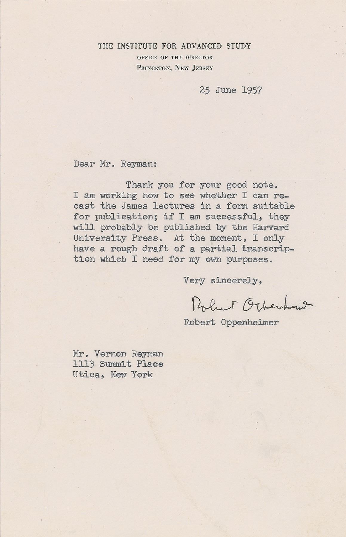 Brilliant American physicist (1904-1967) who directed the Institute for Advanced Study in Princeton and who spearheaded the Manhattan Project, leading to the development of the first atomic bomb. TLS, one page, 5.5 x 8.5, The Institute for Advanced Study letterhead, June 25, 1957. Written from Princeton, a letter to Vernon Reyman, in full: "Thank you for your good note. I am working now to see whether I can recast the James lectures in a form suitable for publication; if I am successful, they will probably be published by the Harvard University Press. At the moment, I only have a rough draft of a partial transcription which I need for my own purposes." In fine condition. In 1957, Oppenheimer served as the William James Lecturer at Harvard University, a platform for some of the most influential thinkers of the 20th century. Sponsored by the Philosophy and Psychology Department, Oppenheimer's series of eight lectures, entitled 'A Hope of Order,' discussed relevant examples from atomic physics and quantum theory, with Oppenheimer placing a 'strong emphasis on the idea that examining an object from one point of attack may yield the maximum possible information about that object but not all the information, since another point of view might have given different information, but would have excluded the first approach.'