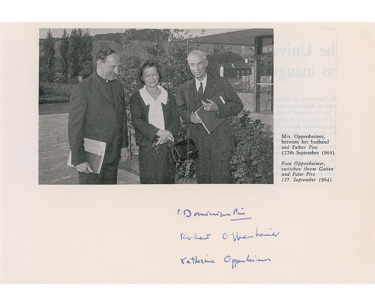 Uncommon ballpoint signature, “Robert Oppenheimer,” on an off-white 8.25 x 5.75 card, also signed by his wife, “Katherine Oppenheimer” and signed in fountain pen by a Nobel Peace Prize winner, ”Dominique Pire.” A clipped magazine photo of the three together is affixed above the signatures. A very light crease passing between Oppenheimer’s first and last names, and a vertical crease to the magazine photo, otherwise fine condition. An interesting, unique assemblage of autographs.