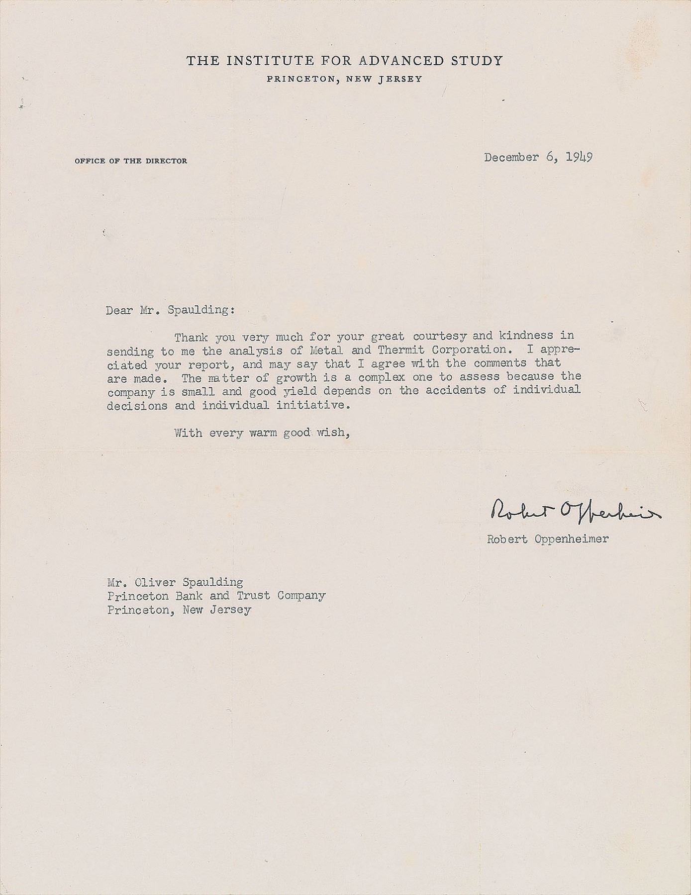 TLS, one page, 8.5 x 11, The Institute for Advanced Study letterhead, December 6, 1949. Letter to Oliver Spaulding, in full: "Thank you very much for your great courtesy and kindness in sending to me the analysis of Metal and Thermit Corporation. I appreciated your report, and may say that I agree with the comments that are made. The matter of growth is a complex one to assess because the company is small and good yield depends on the accidents of individual decisions and individual initiative." In fine condition.