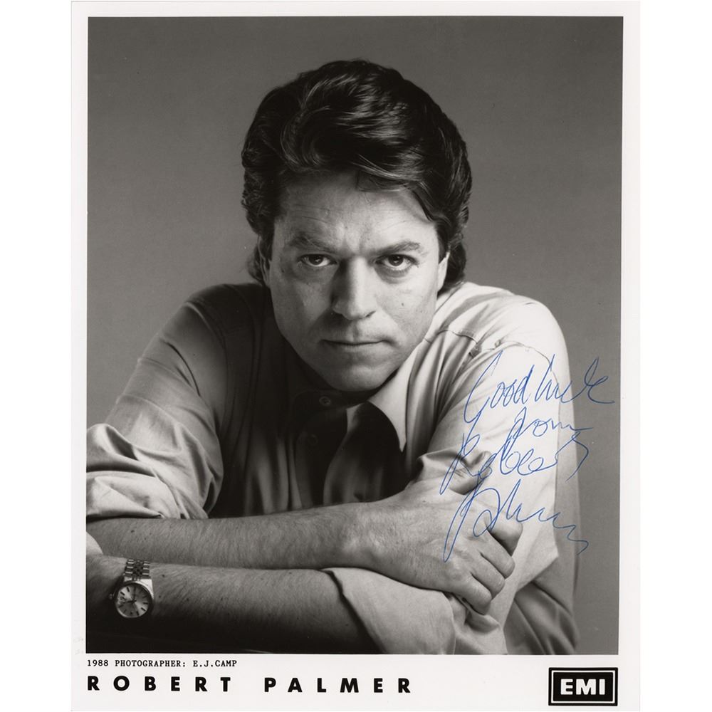 Glossy 8 x 10 EMI Records publicity photo of Palmer dating to his Heavy Nova album, signed in blue ballpoint, "Good luck from Robert Palmer." In fine condition.