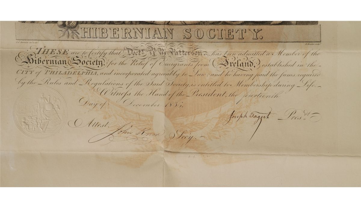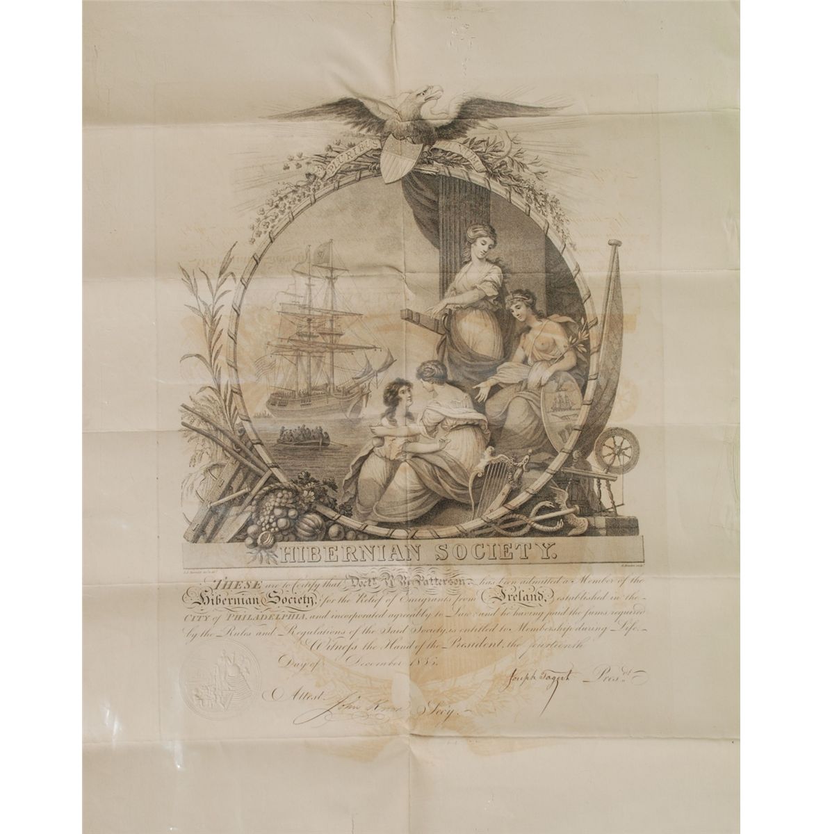 A certificate of membership in the Hibernian Society for relief of Irish immigrants. December 14, 1836. Approx. 18 x 23.75 in. Signed by John Knox, Secretary, and Joseph Tagert, President. Featuring a wonderful lithograph of women, with ship in background and rowboat shuttling men ashore, cornucopia with fruits of harvest in one corner of surround, spinning wheel, caducea in other corner, American eagle at top. The women possibly represent the various nations - Liberty, Hibernia, Britannia, etc. Through the 1830s, the island, always plagued by poverty, was ravaged by epidemics such as cholera, which started the wave of immigration to America long before the famines of 1845-1852. This is likely the reason the doctors were involved and the caducea is prominent on this certificate.