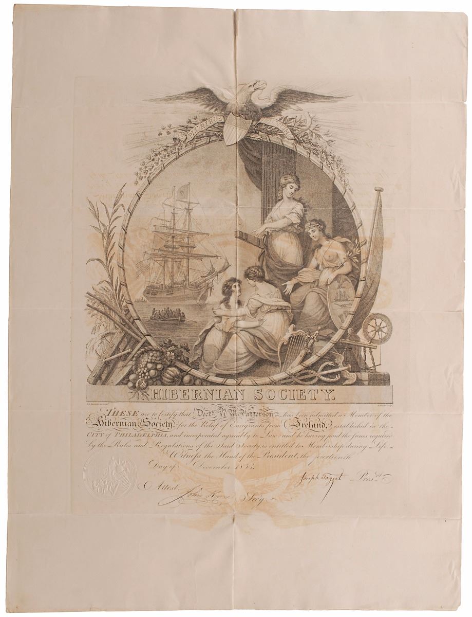 Professor (1787–1854) at the University of Pennsylvania, director of the US Mint, and cryptology enthusiast who frequently exchanged coded messages with Thomas Jefferson. Partly-printed DS issued to Patterson, signed by Joseph Tagert and John Knox, one page, 18 x 24, December 14, 1836. Beautifully engraved document issued “to Certify that Doctr R. M. Patterson has been admitted a Member of the Hibernian Society, for the Relief of Emigrants from Ireland, established in the City of Philadelphia.” In very good to fine condition, with intersecting folds with some separations repaired with tape to reverse, a few edge tears, and some ink transfer from the engraved vignette.