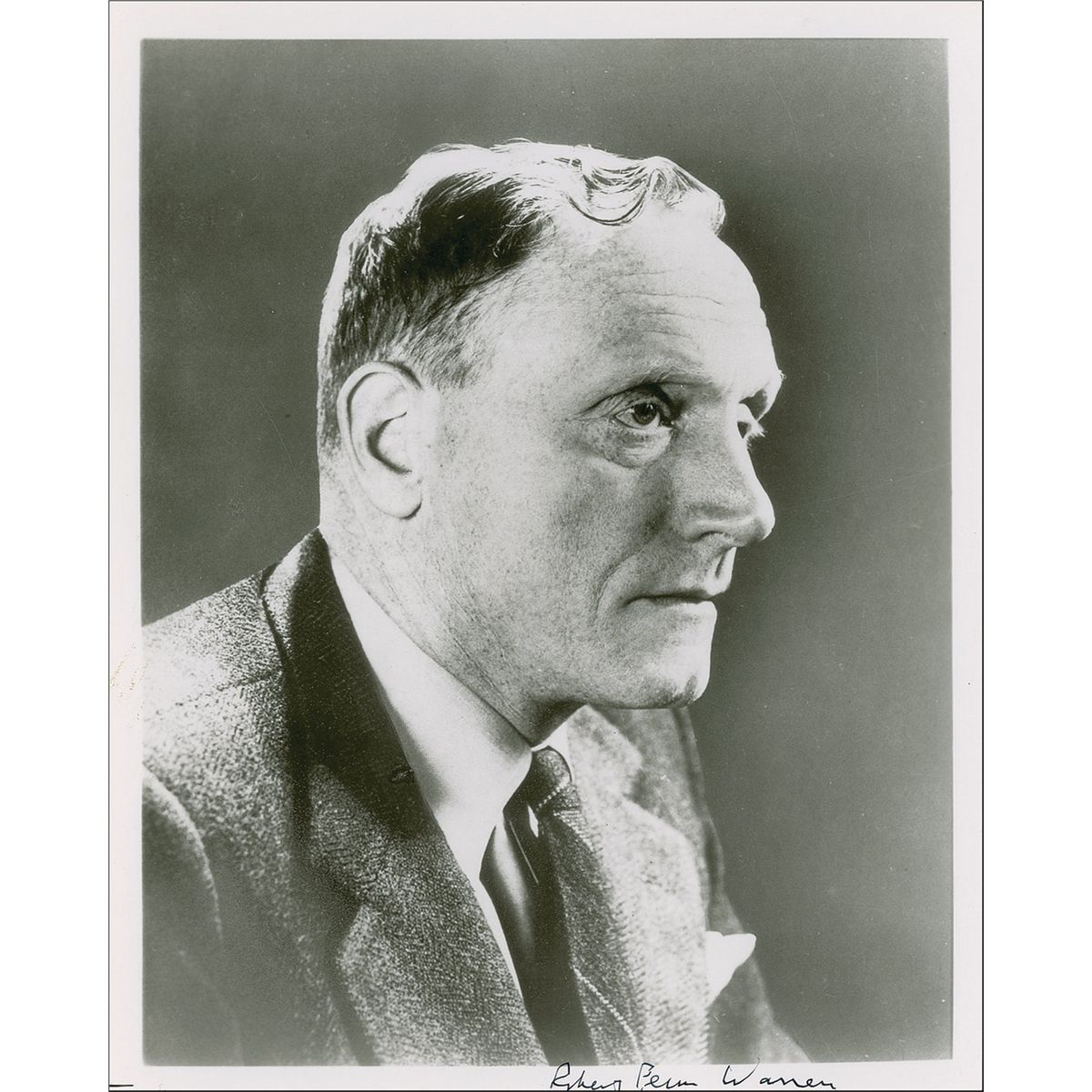 Pulitzer Prize–winning American author (1905–1989) best known for his classic 1946 novel All the King’s Men. Distinguished glossy 8 x 10 head-and-shoulders profile photo, signed in the bottom border in black ballpoint. In fine condition.