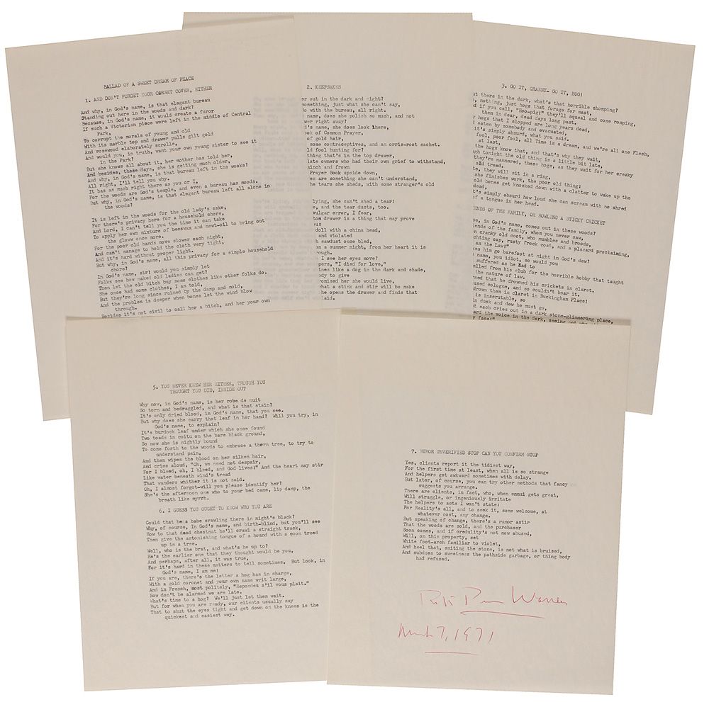 Souvenir typescript, five pages, 8.5 x 11, an excerpt from his play Ballad of a Sweet Dream of Peace, signed at the conclusion in red ballpoint, “Robert Penn Warren, March 7, 1971.” In fine condition, with a trivial crease to the first page.