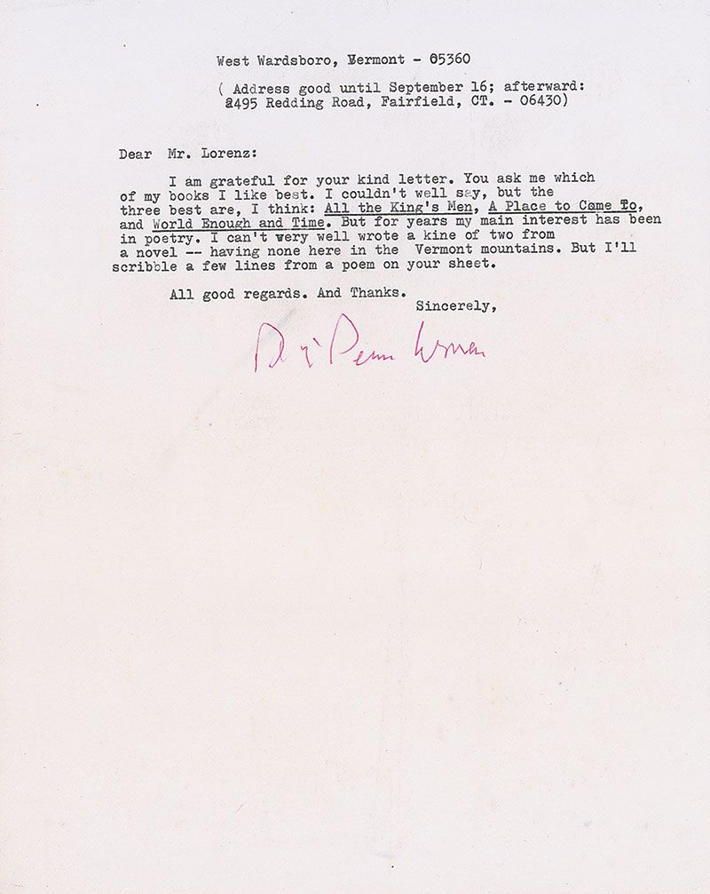 Glossy 8 x 10 head-and-shoulders photo of Warren, signed in the lower border in black ballpoint; and a TLS, one page, 8.5 x 11, no date. Letter to an admirer reads, in part: “You ask me which of my books I like the best. I couldn’t well say, but the three best are, I think: All the King’s Men, A Place to Come To, and World Enough and Time.” In fine condition, with intersecting folds to letter.