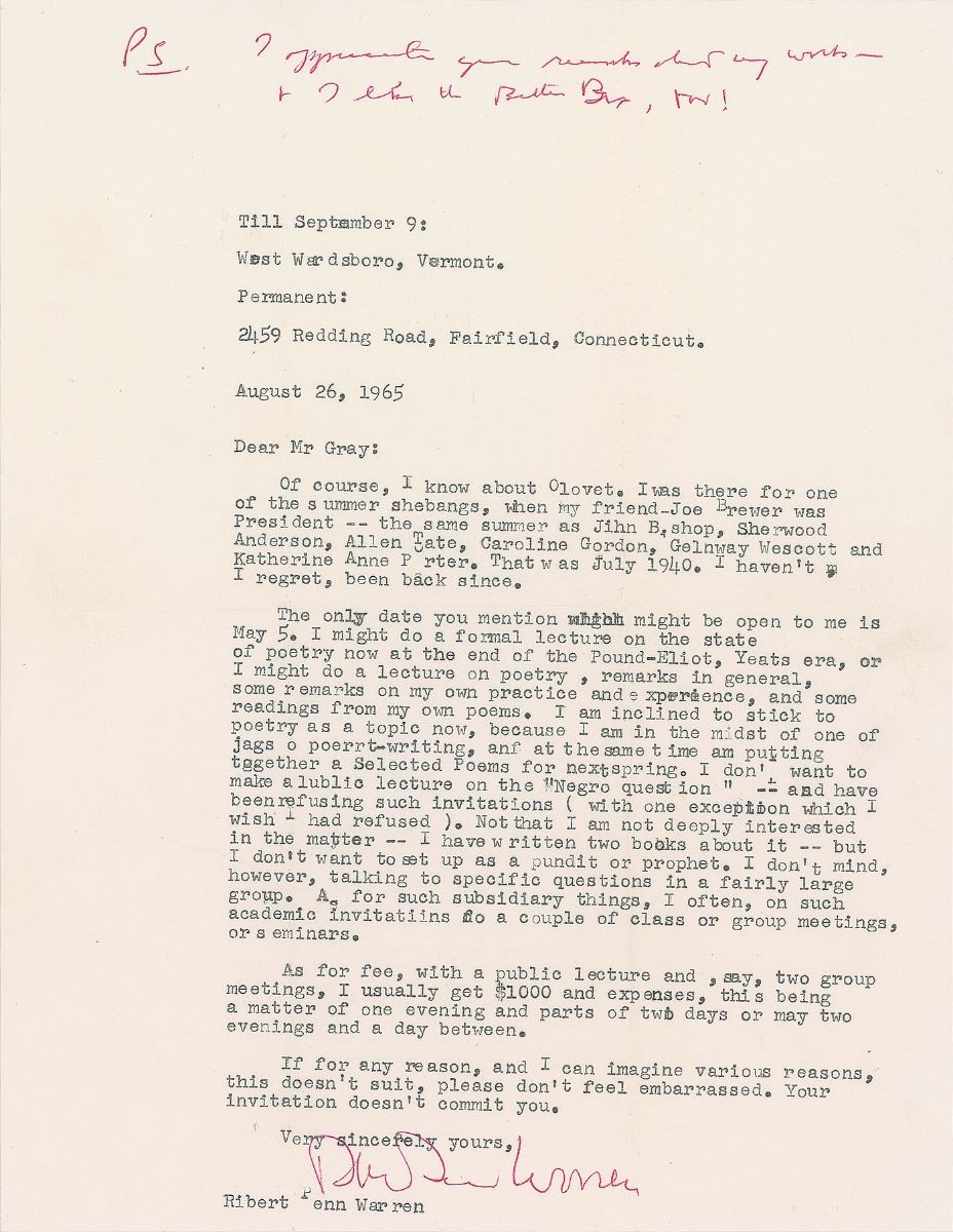 TLS, one page, 8.5 x 11, August 26, 1965. Letter to a professor at Olivet College in Michigan. In part (spelling and grammar retained): “Of course, I know about Olovet. I was there for one of the summer shebangs, when my friend Joe Brewer was President—the same summer as Jihn Bishop, Sherwood Anderson, Allen Tate, Caroline Gordon, Gelnway Wescott and Katherine Anne Porter. That was July 1940…I might do a formal lecture on the state of poetry now at the end of the Pound-Eliot, Yeats era, or I might do a lecture on poetry, remarks in general, some remarks on my own practice and experience, and some readings from my own poems. I am inclined to stick to poetry…I don’t want to make a lublic lecture on the ‘Negro question.’” He adds a handwritten postscript at the top, in part: “I appreciate your remarks about my work.” In fine condition. Accompanied by the original mailing envelope.