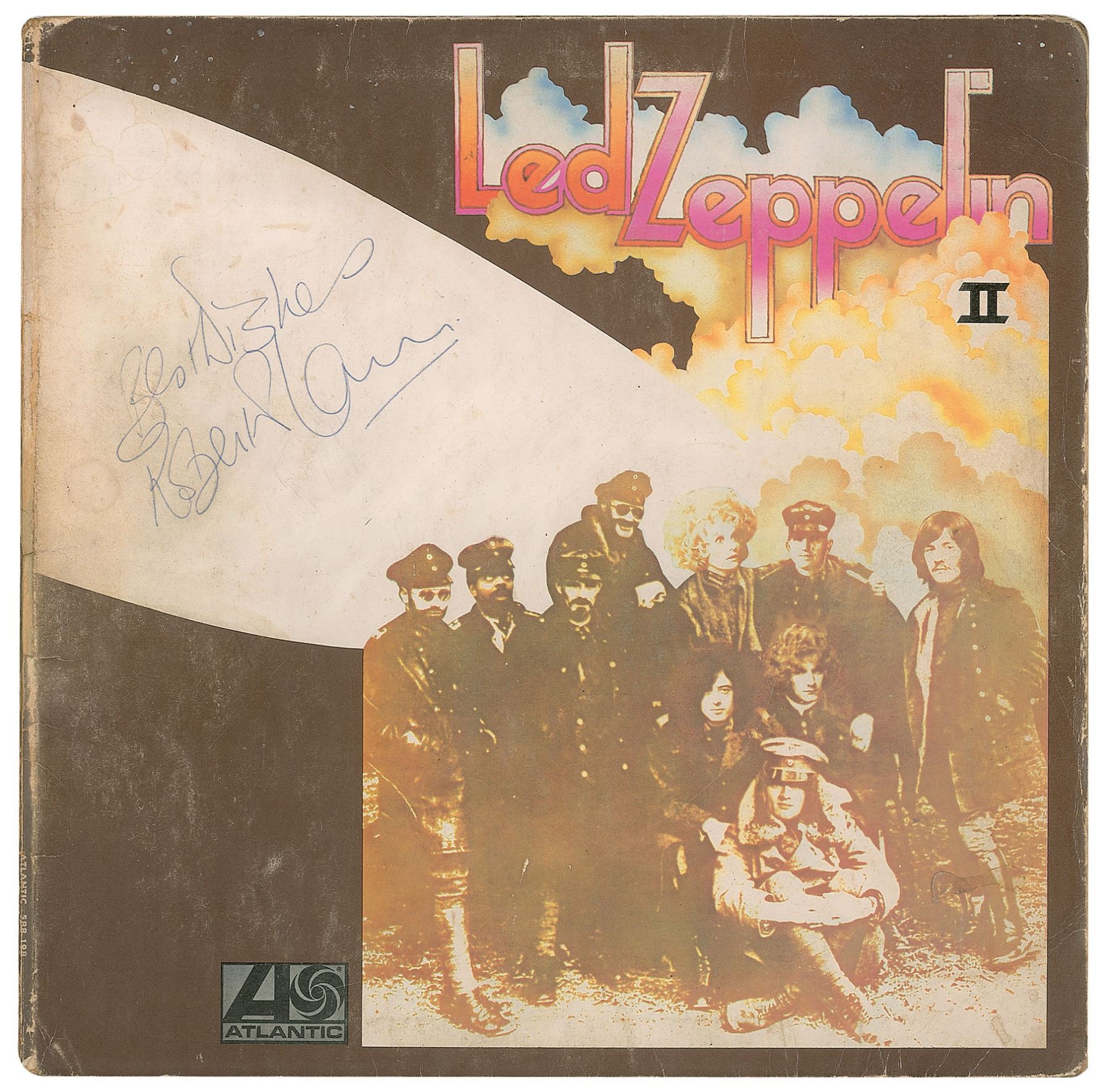 Led Zeppelin II album signed on the front cover in black ballpoint, "Best wishes, Robert Plant." In very good condition, with scuffing, soiling, edge wear, and partial separation along the spine. The record is not included.