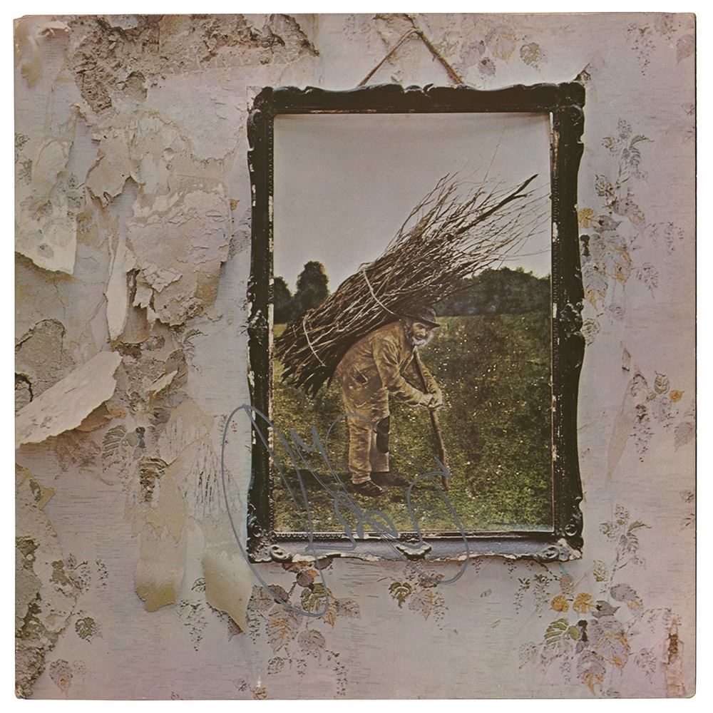 Led Zeppelin IV album signed on the front cover in silver ink by Robert Plant. In fine condition. The record is not included.