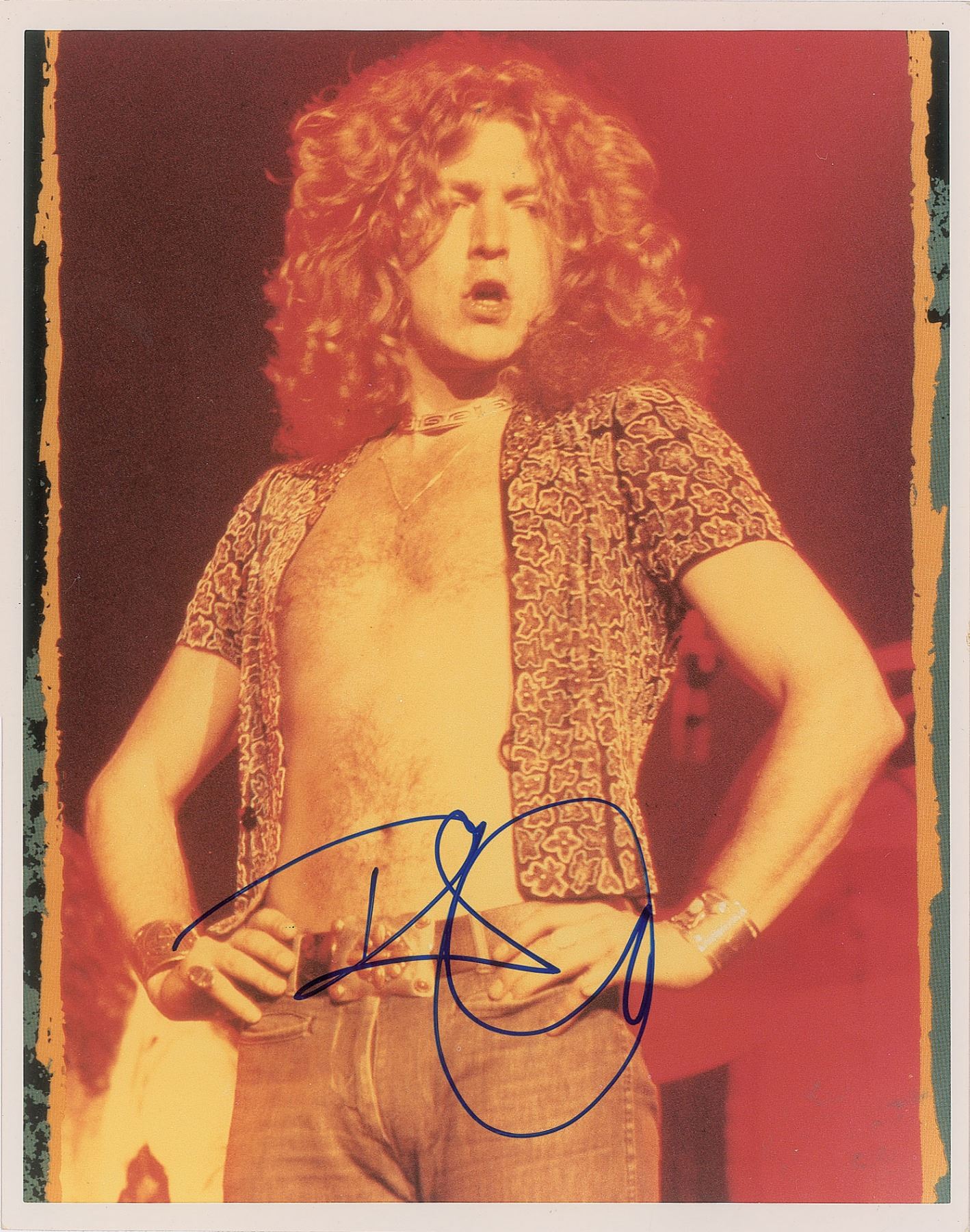 Color glossy 8 x 10.25 photo of the Led Zeppelin frontman in an eccentric half-length pose, signed in blue felt tip by Robert Plant. In very fine condition.