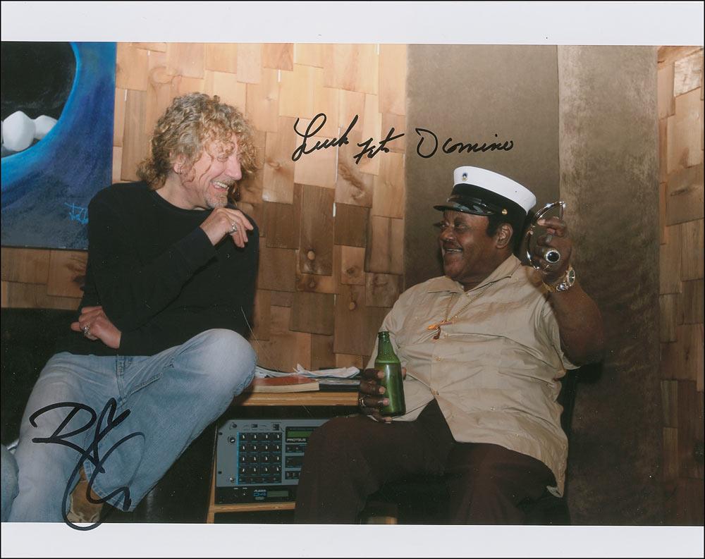 Color satin-finish 14 x 11 photo of Plant and Domino sharing a laugh and a beer, signed in black felt tip, “Robert Plant” and “Luck, Fats Domino.” In fine condition, with a couple of small creases.