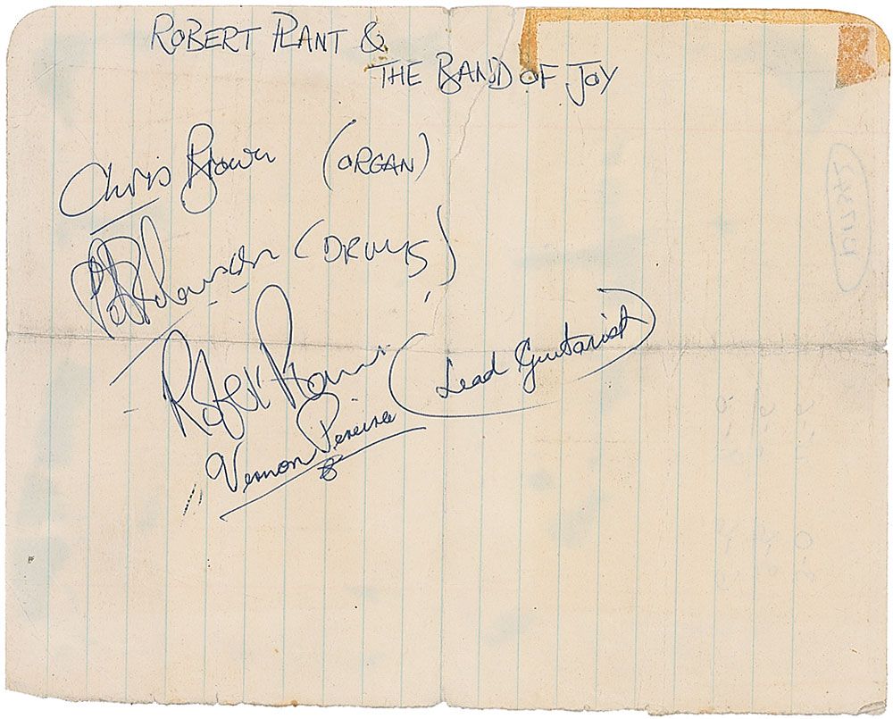Vintage ballpoint signatures, “Robert Plant,” “Chris Brown (organist)”, “Pete Robinson (drums),” and “Vernon Pereira (lead guitarist),” on an off-white 8 x 6.25 lightly-lined sheet, with a collector’s notation along top edge. In very good condition, with central horizontal and vertical folds, scattered creases, a vertical tear from top edge to center, and some old tape toning to upper right. Formed in 1966, the Band of Joy would see several incarnations, including the addition of future Led Zeppelin band mate John Bonham on drums in 1967. Accompanied by a certificate of authenticity from Tracks.