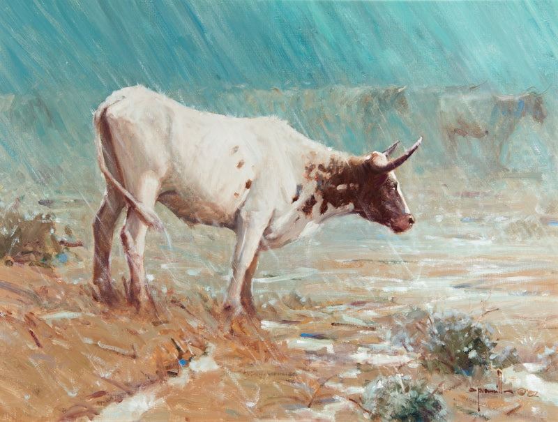 To the unaided eye, this piece appears to be in excellent condition. Inspection under ultraviolet light reveals a normal fluorescence of the artist's pigments. There are no signs of damage or restoration. The piece is framed in a semi-rustic stained wooden frame with a chocolate brown suede panel and a gold fillet. The frame is in very good condition with normal signs of wear. Plate: A Little Rain, Robert Pummill Verso: [handwritten on back of frame] #12