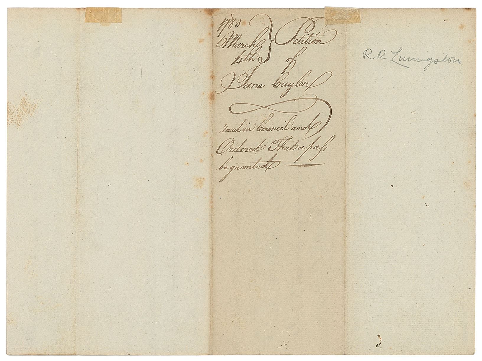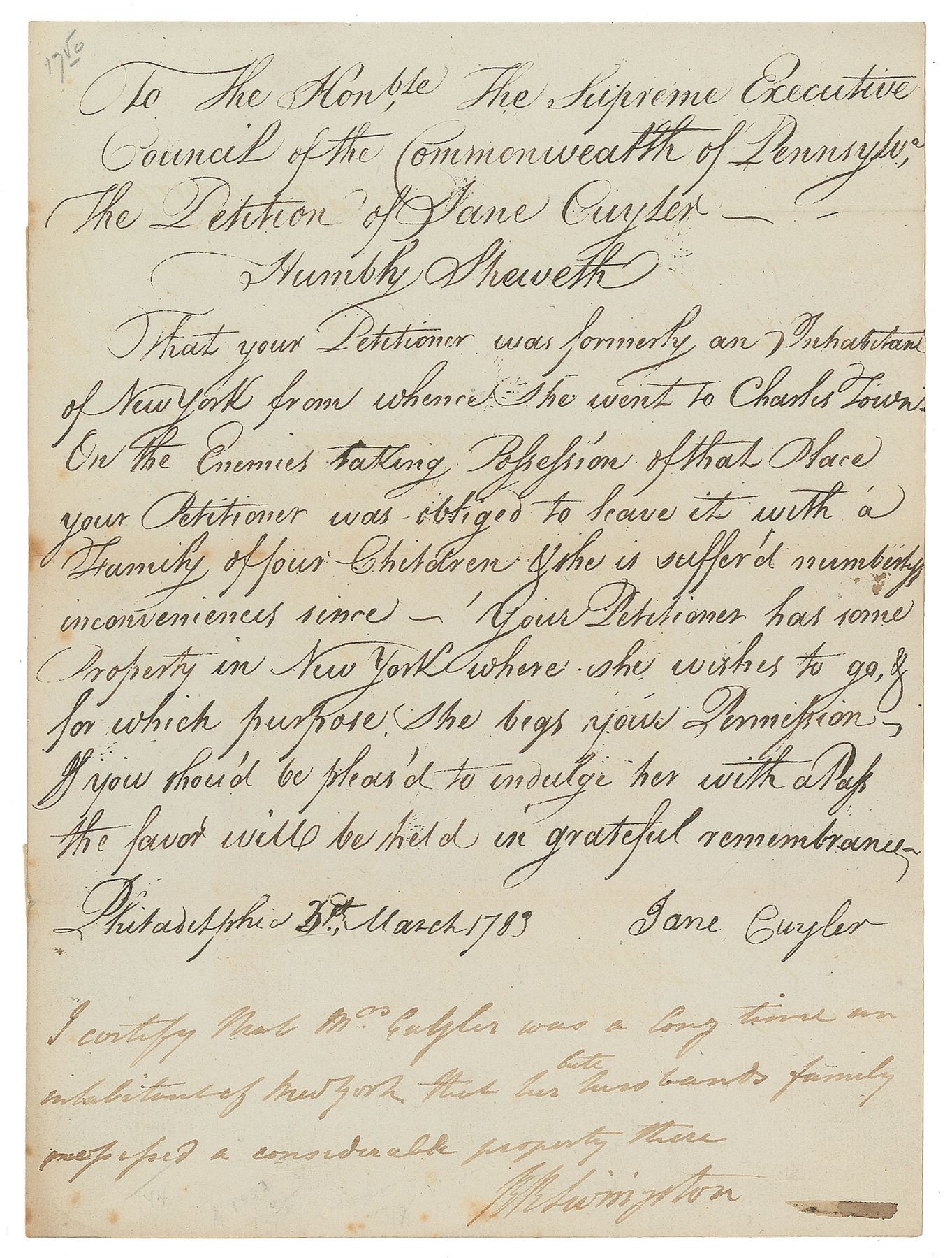 Revolutionary War-dated handwritten endorsement, signed "R. R. Livingston," penned at the bottom of a petition from Jane Cuyler, one page, 7 x 9.5, March 31, 1783. Livingston's endorsement reads: "I certify that Mrs. Cuyler was a long time an inhabitant of New York that her late husband's family possessed a considerable property there." The Cuyler petition is addressed to the "Supreme Executive Council of the Commonwealth of Pennsylvania," and states that she "was formerly an Inhabitant of New York from whence she went to Charles Town on the Enemies taking Possession of that Place your Petitioner was obliged to leave it with a Family of four Children…Your Petitioner has some Property in New York where she wishes to go, & for which purpose she begs your Permission." In fine condition. Accompanied by a complete typescript from the Lincoln Library in Shippensburg, Pennsylvania.