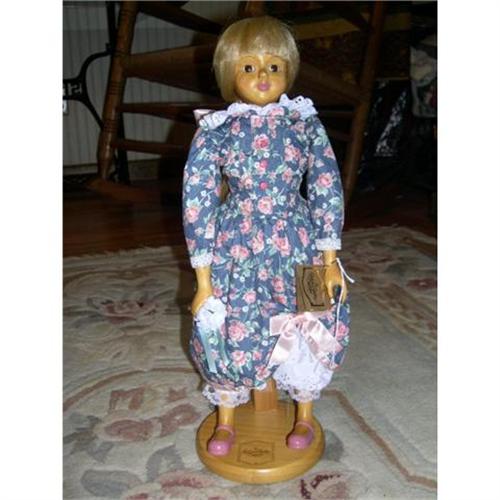 Limited Edition Robert Raikes doll named Claire. Dolls head is marked Robert Raikes VVV, 1627/7500. Doll has wood head, arms and legs, body is cloth. Original paper tag by Applause is on wrist. Doll wears original outfit including molded painted pink shoes as part of her wood feet. Doll is 17" tall on marked wooden original stand, makes her 17.5". Item is from smoke free environment. Buyer to pay $15.00 for shipping, insurance and handling. Thanks for viewing.