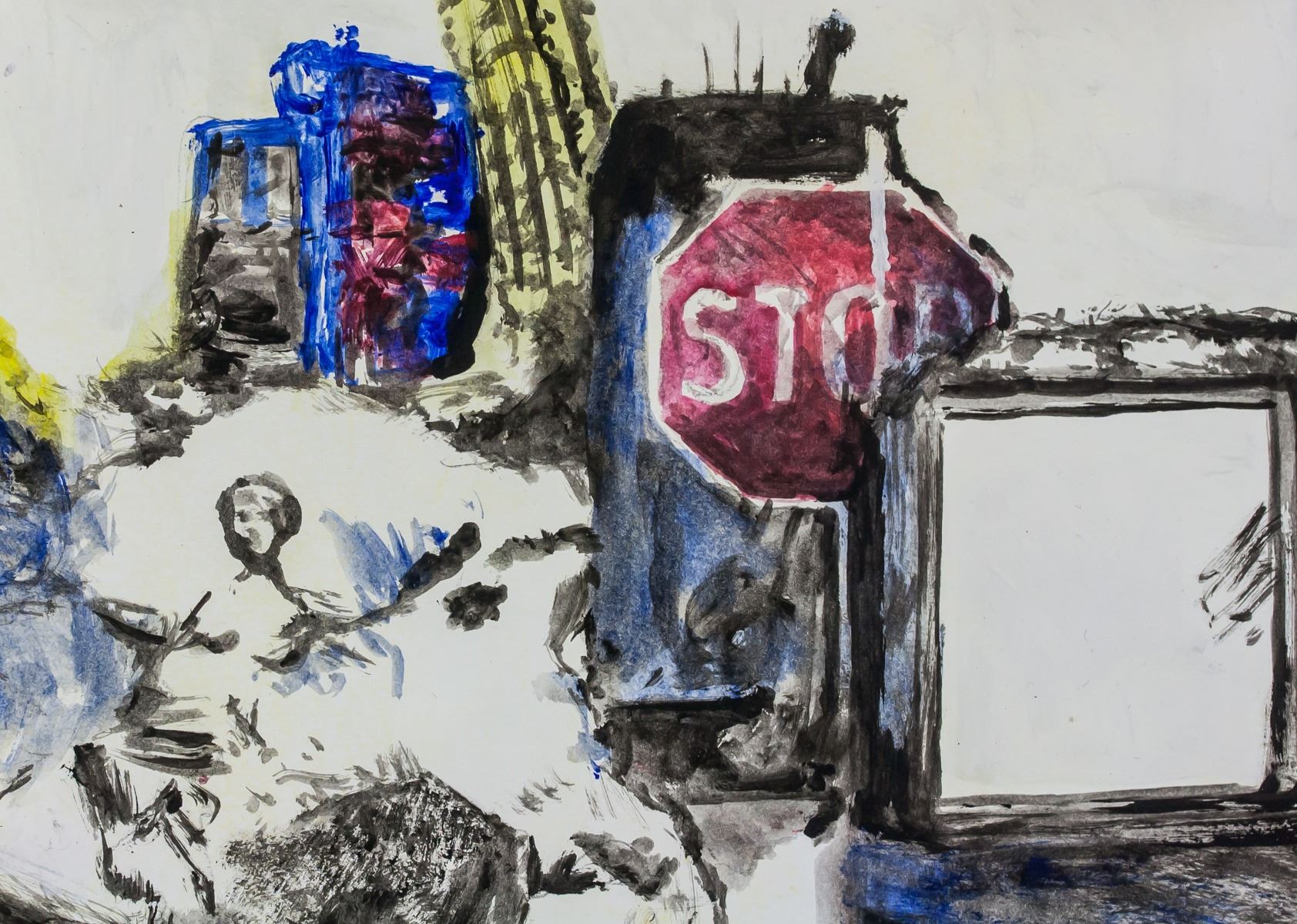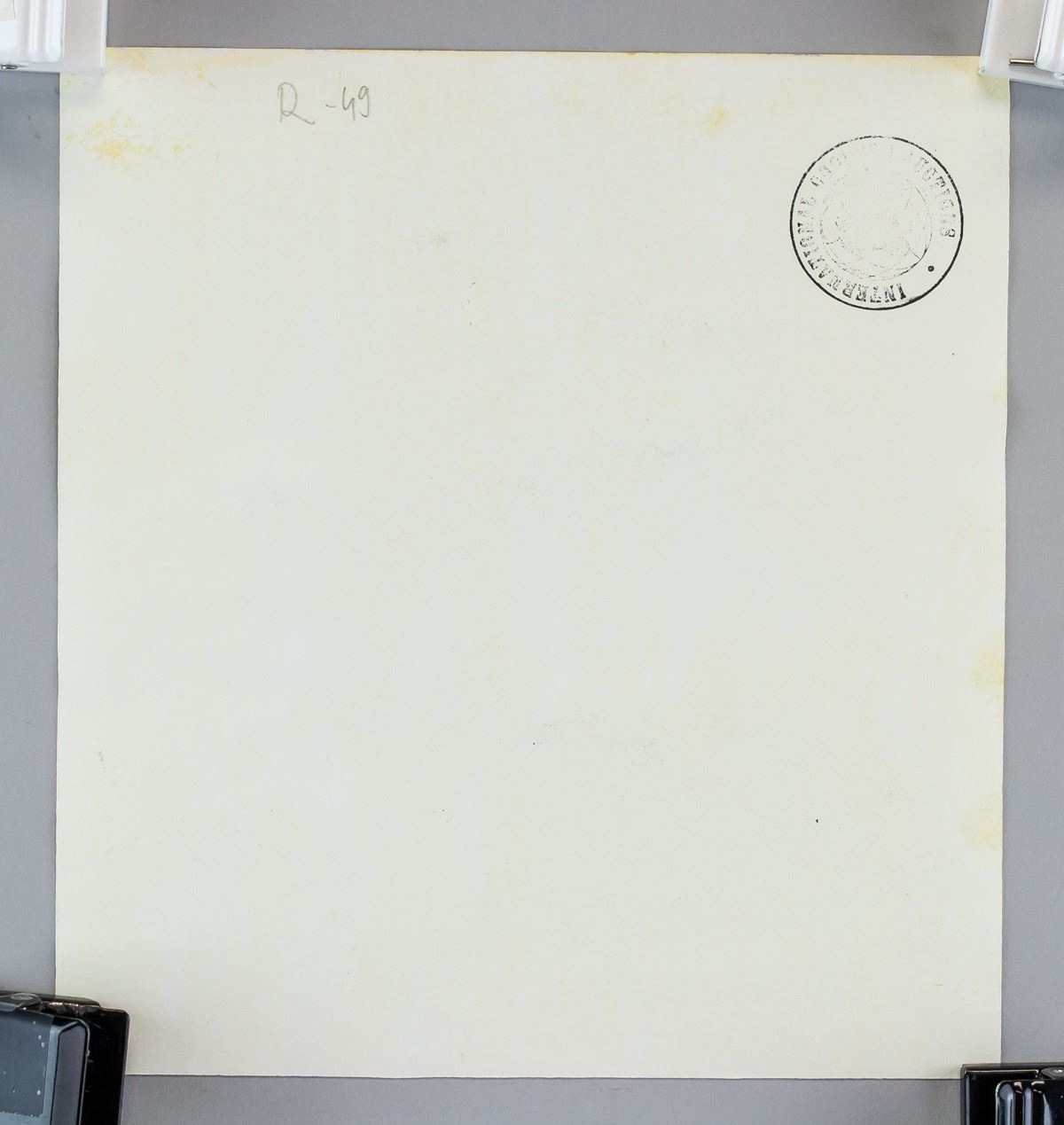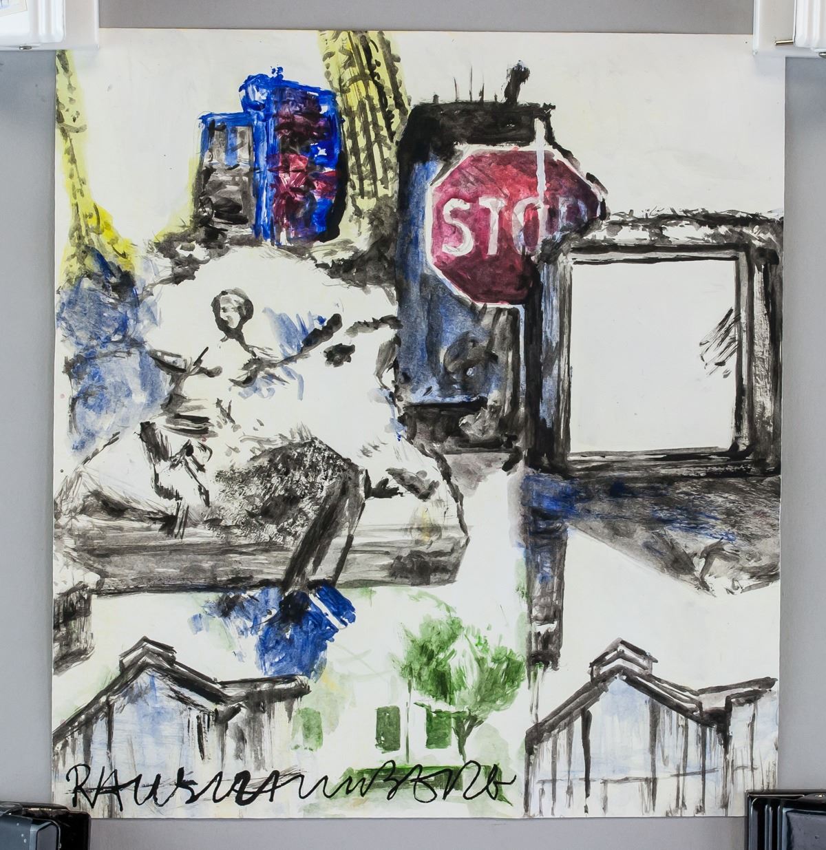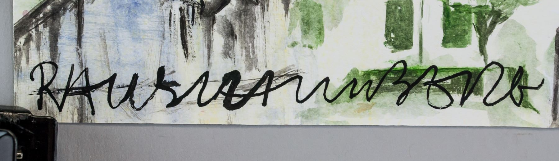 Mixed Media on paper. Featuring a landscape composition scene. Signed Rauschenberg on the lower left corner. Stamped on top right corner and inscribed in pencil R-49 on top left corner, verso. Attributed to Robert Rauschenberg (1925-2008, American). 21.5 x 20 cm (8.5 x 7.8 inches). PROVENANCE: Southern Ontario estate